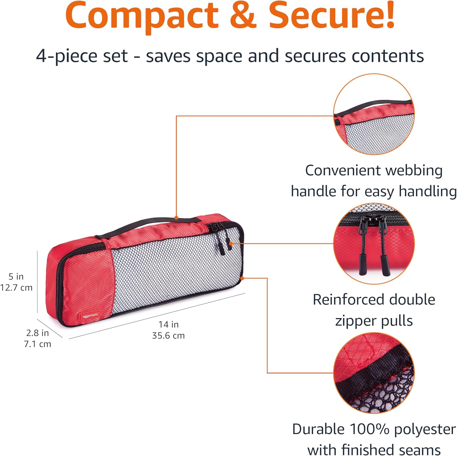 Amazon Basics Slim Packing Cubes for Travel, Packing Organizers, 4-Piece-Set With Double Zipper Pulls and Mesh Top Panel, 100% Durable Polyester, Red, 14"L x 5"W x 3"H