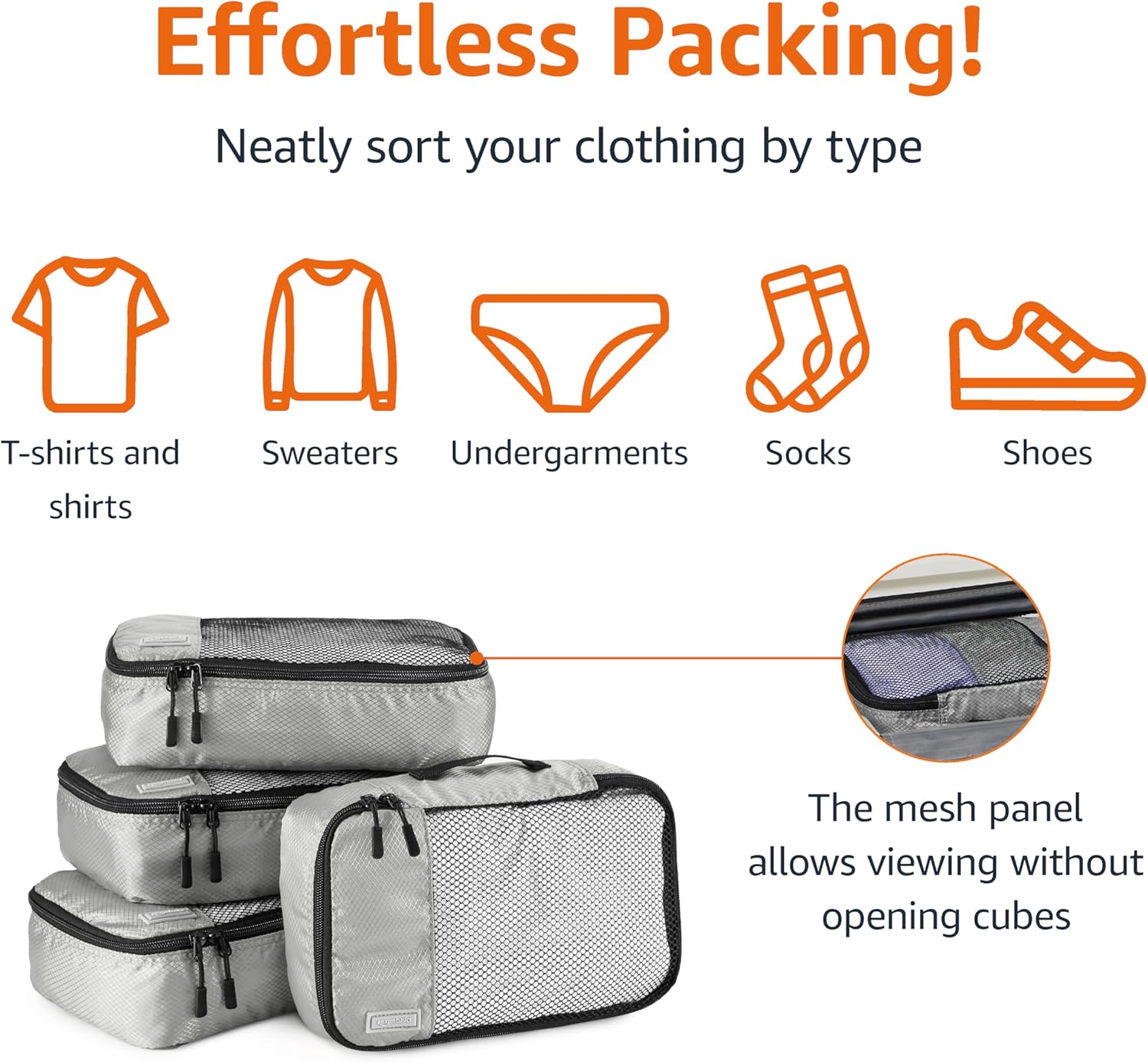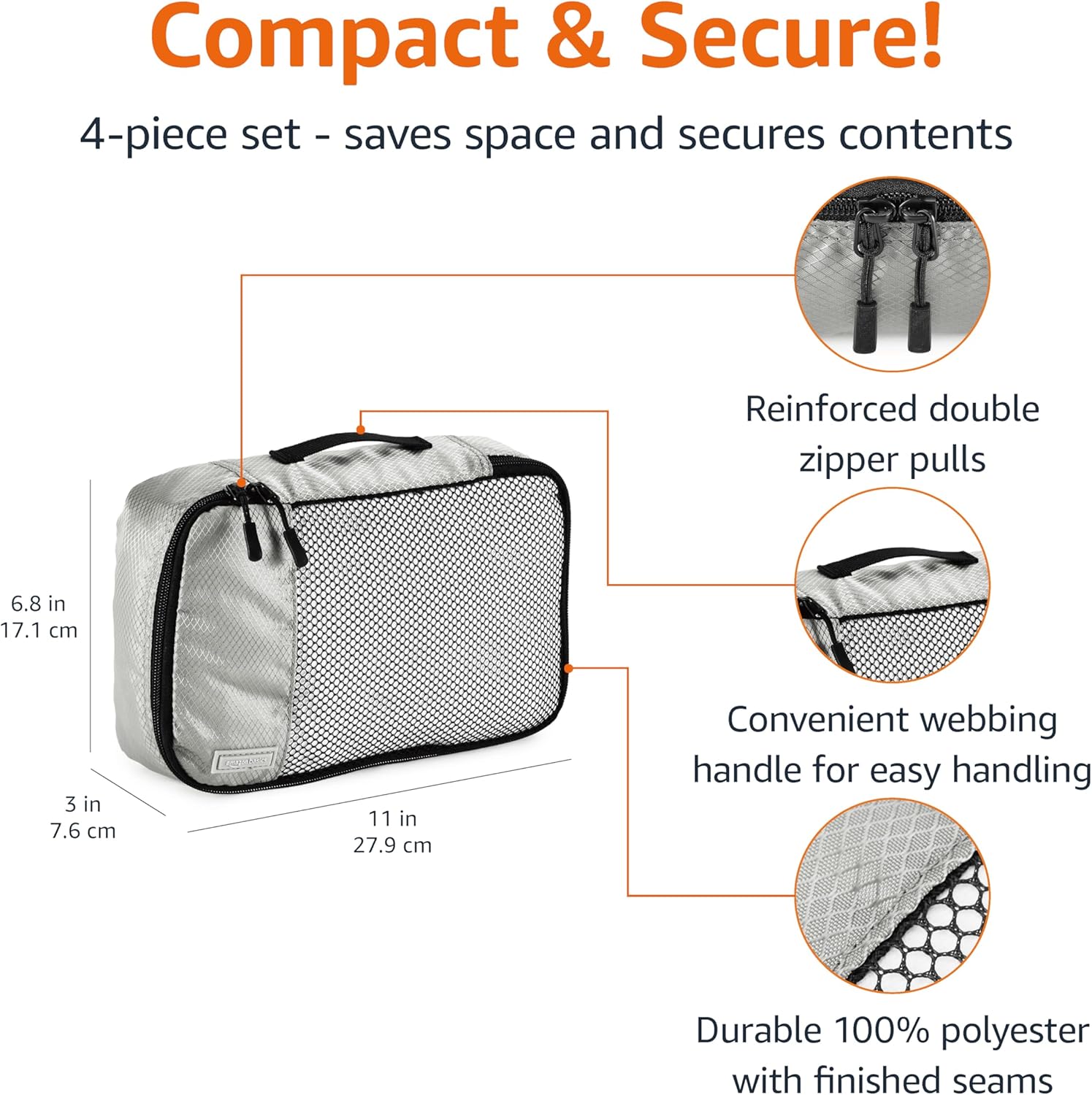 Amazon Basics Small Packing Cubes for Travel, Packing Organizers, 4-Piece-Set With Double Zipper Pulls and Mesh Top Panel, 100% Durable Polyester, Gray, 11"L x 6.8"W x 3"H