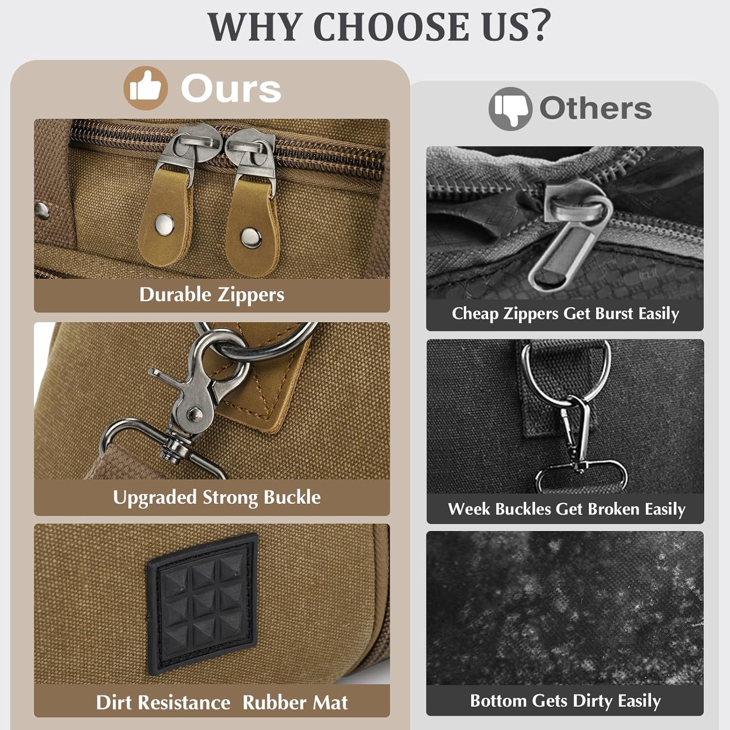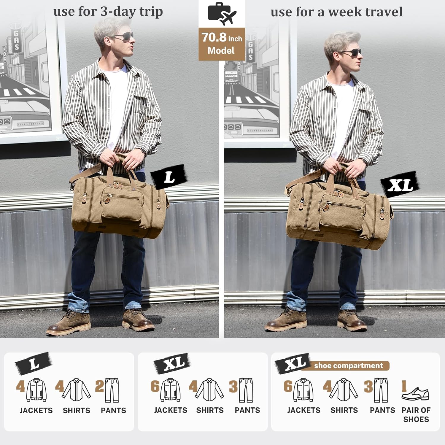 - Multipurpose: Suitable for both men and women, the Canvas Travel Duffel Bag can be used as a weekender bag, overnight bag, short-term travel bag, toiletry kit, camping bag, business bag, gym tote, carry-on luggage, or simply as an emergency bag