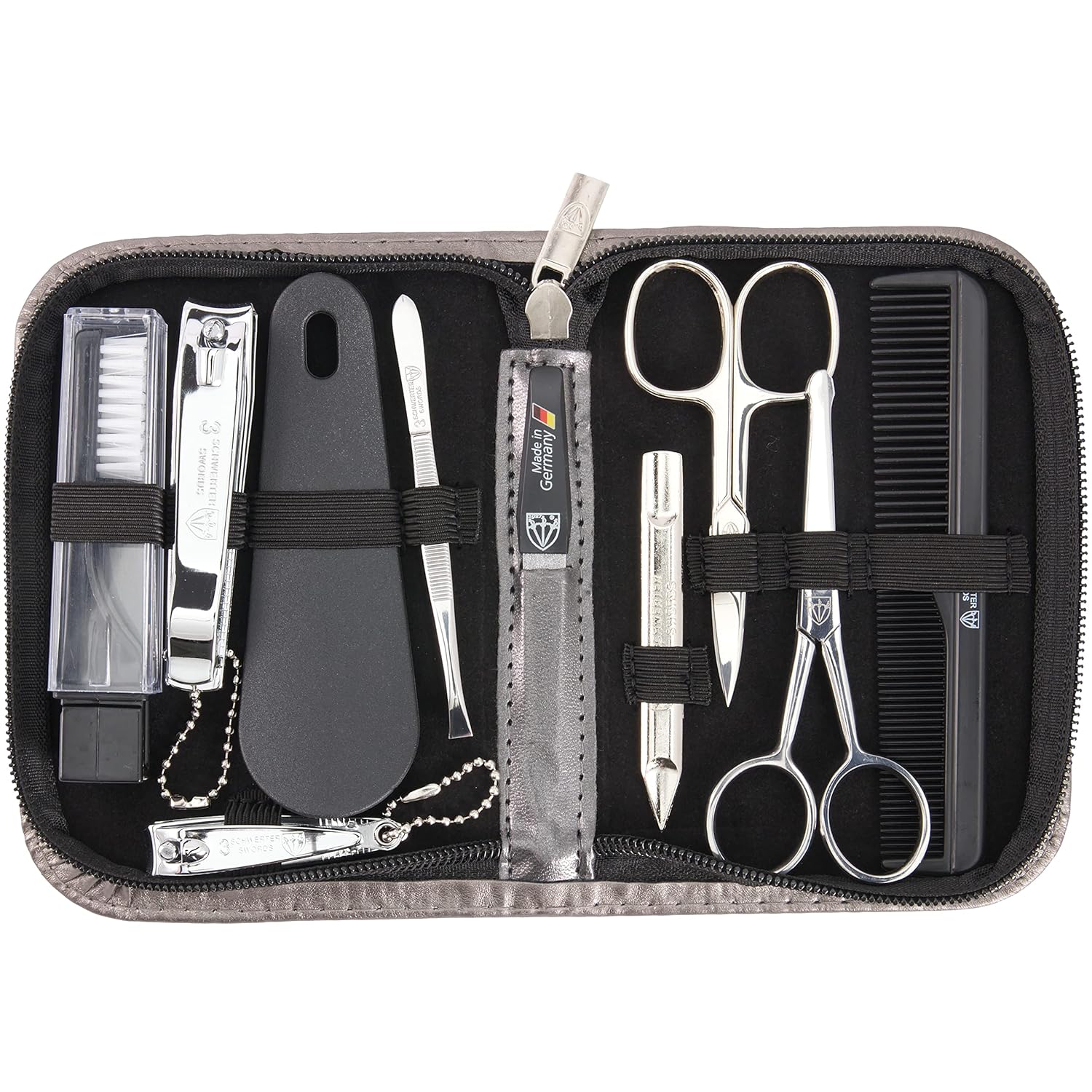- CONTENTS: Nail scissors, finger nail clipper, toe nail clipper, sapphire nail file, tweezers, nose hair scissors, travel tooth brush, hair comb, shoe horn, double instrument (cleaner/pusher).
