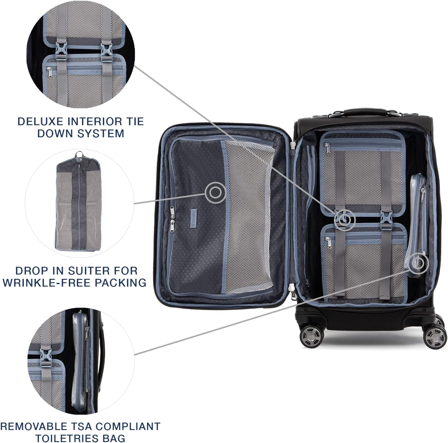 - DURABLE, ORGANIZED TRAVEL: High-density nylon with DuraGuard coating resists wear. Tapered 2" expansion adds space and stability. Interior includes drop-in suiter, tie-down straps with accessory pockets, and a removable wet pocket