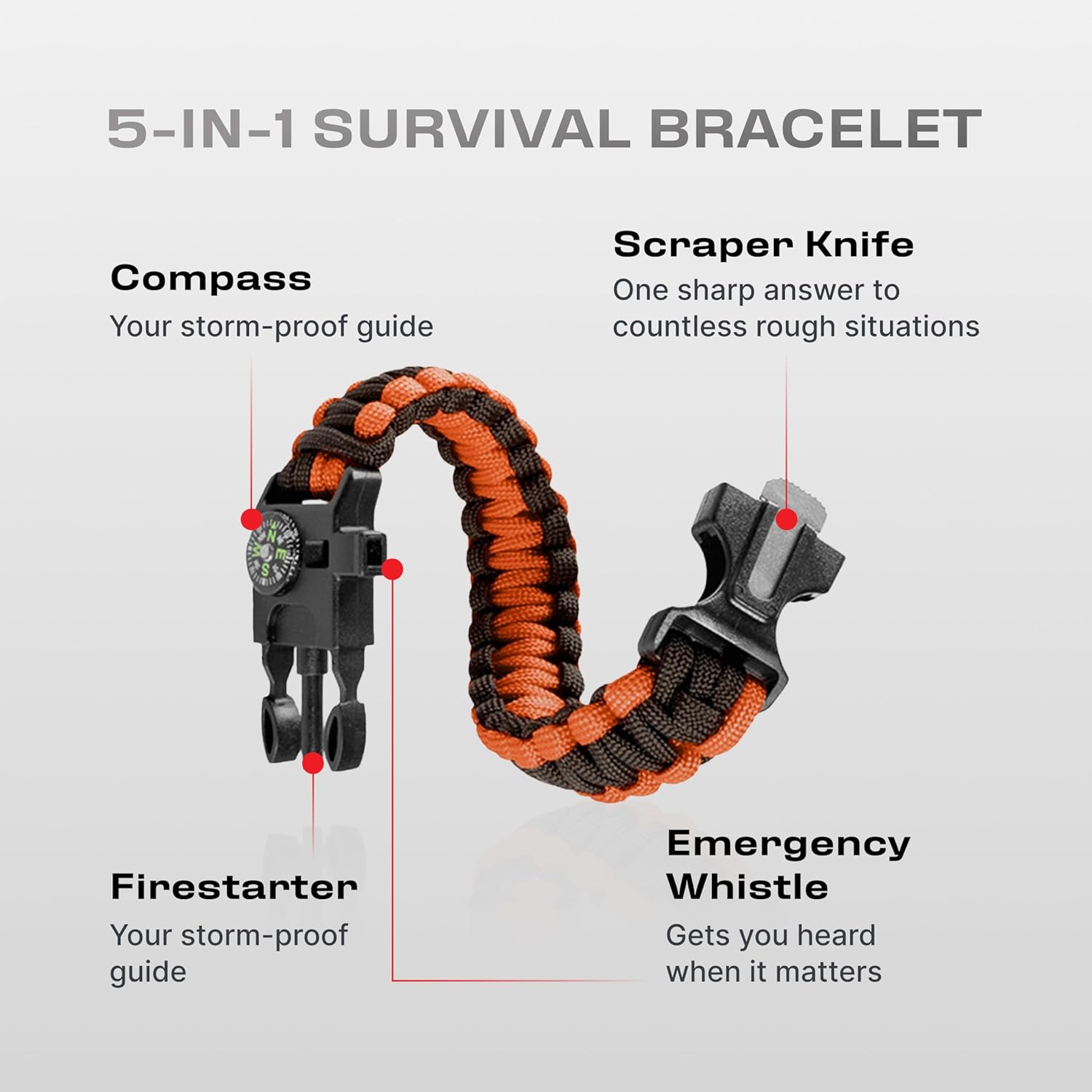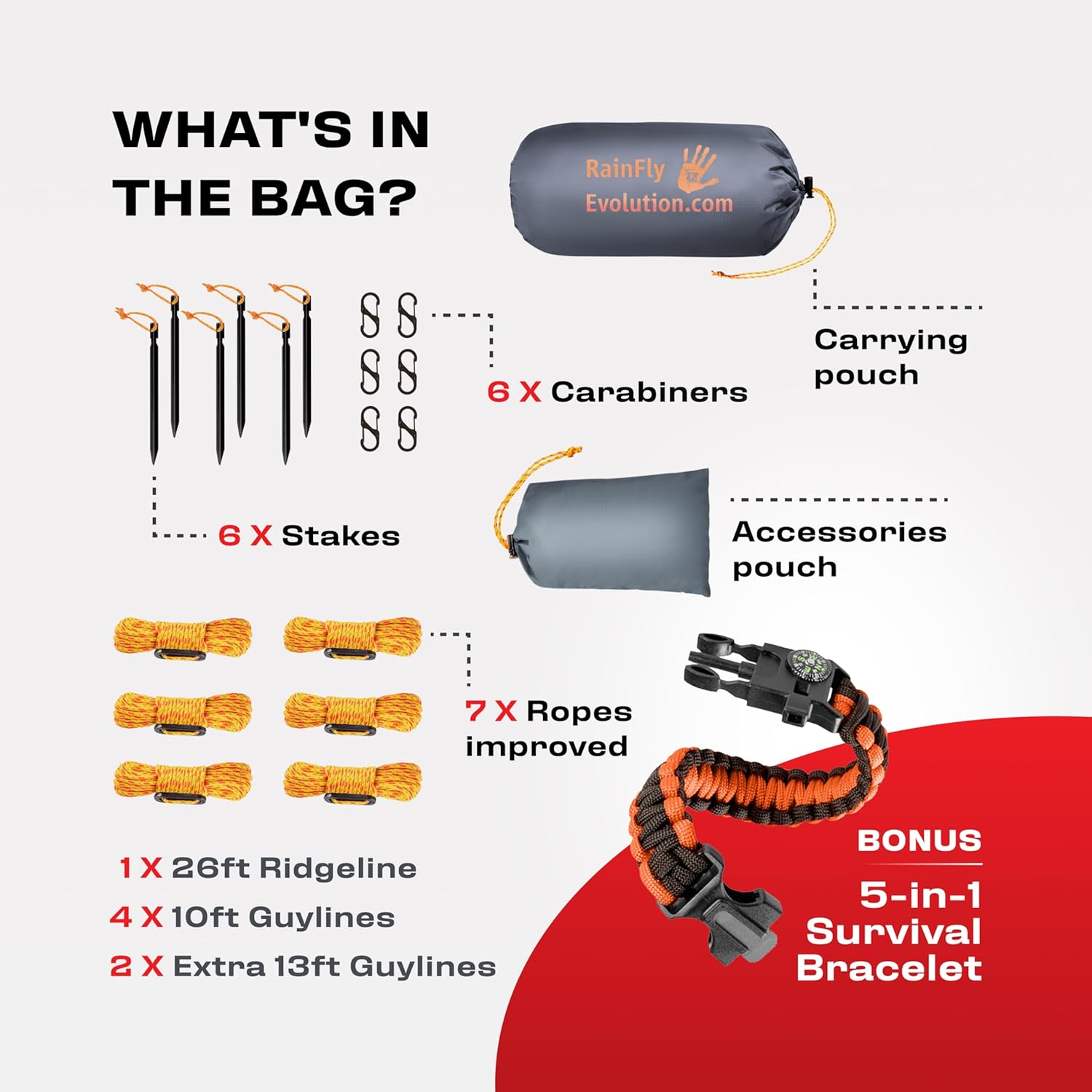- THE GEAR YOU NEED IN ONE PLACE. Comes with 1 rainfly tarp, 6 aluminium stakes with orange reflective paracord ties, 6 carabiners, 7 adjustable ropes, 1 sack for the ropes and poles and 1 carrying pouch for all your gear. Just pack them together and put them in your bag. And, as a bonus, we’ve added a survival bracelet too!