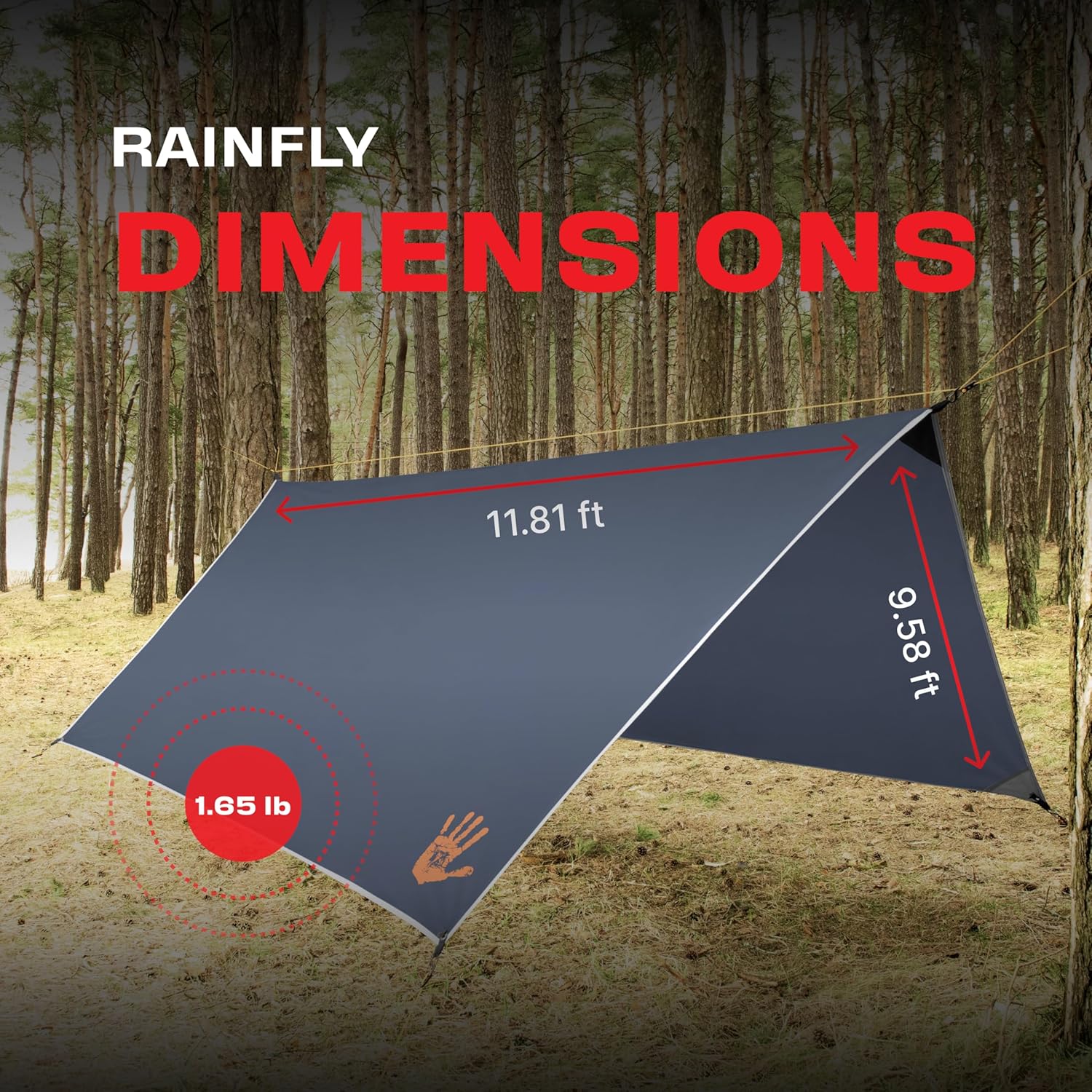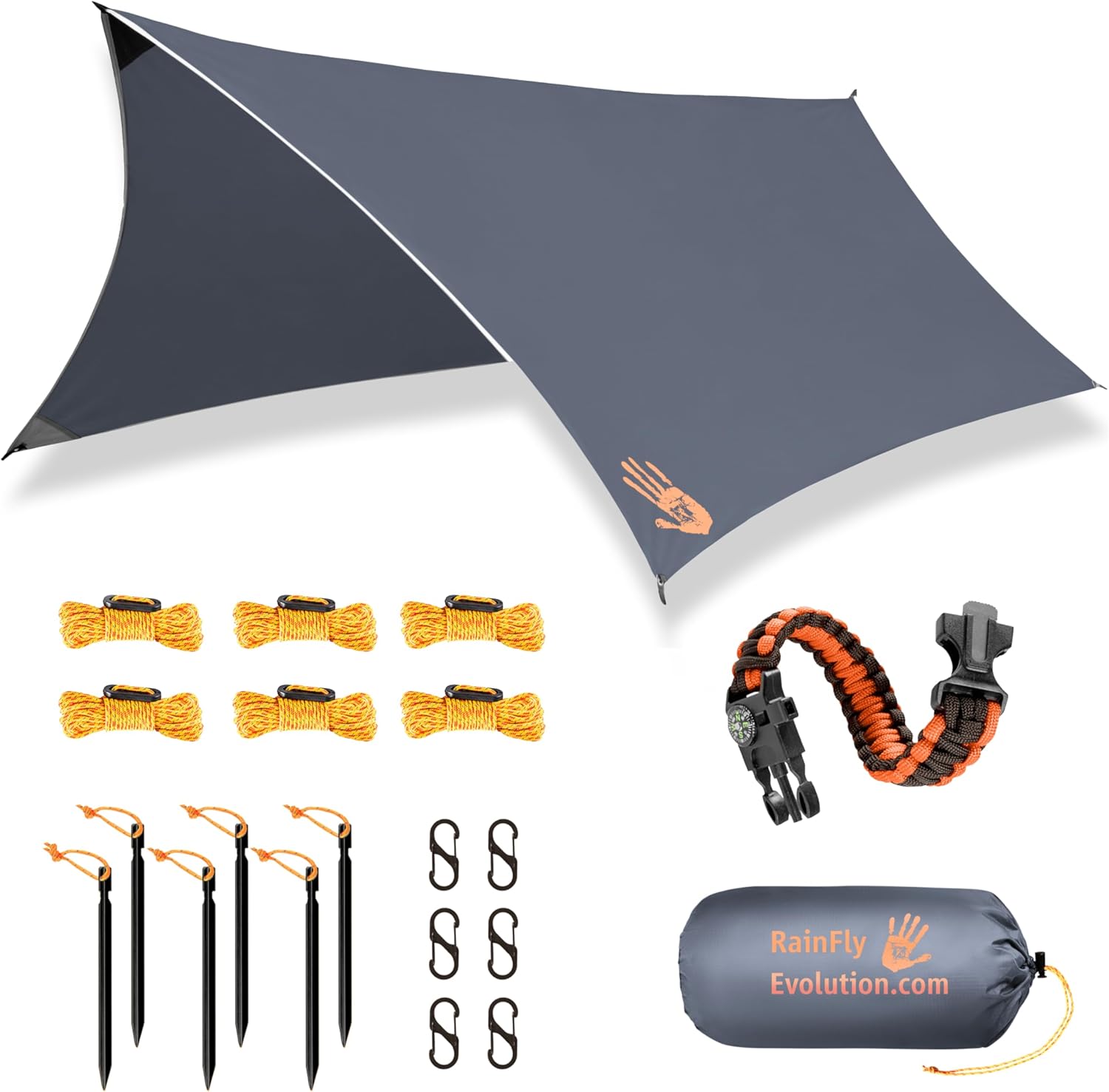 Rain Fly12x10 Lightweight Survival Camping Tarp; 100% Waterproof; Makes a Great Backpacking Tarp or Hammock Shelter; Comes in Multiple Colors, Survival Bracelet Included; Grey
