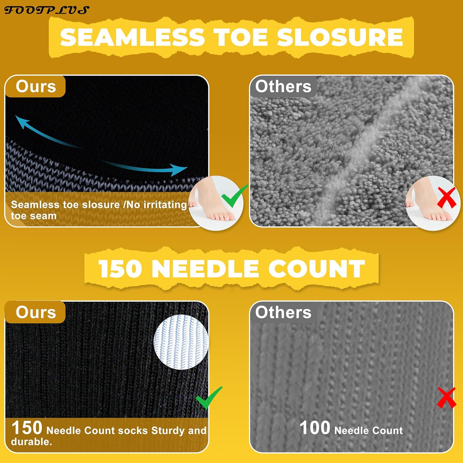 - PREMIUM COMFORT FIT- The cushioned sole gives FOOTPLUS performance running socks a soft feel. The spandex arch& ankle compression provides extra protection. The hand-lined seamless toe ensures protection. The heel tab prevents the socks from slipping down. Foot loop will cover the foot completely to increase double protection from wounds caused by the excessive friction and shoes