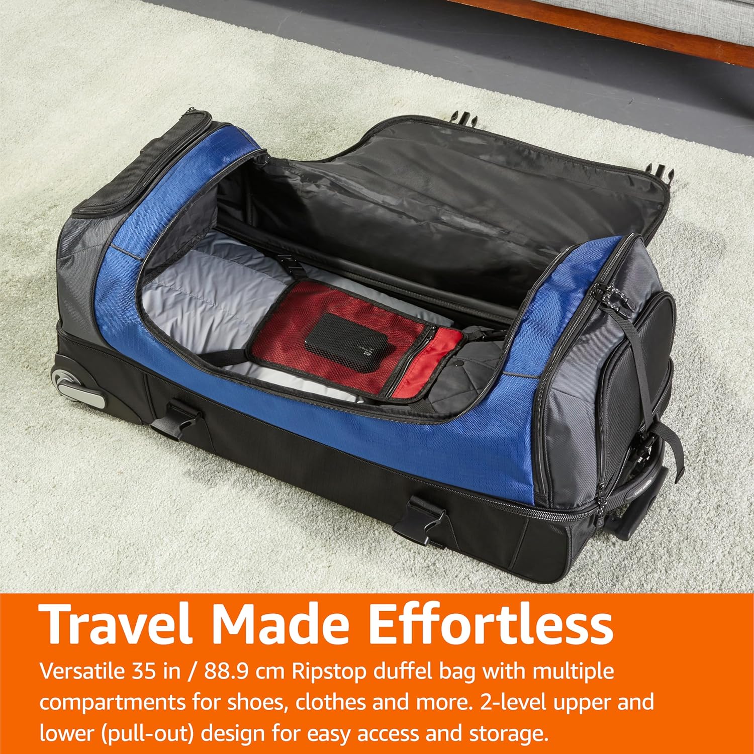 Amazon Basics 35-Inch Large Rolling Duffle Bag with Wheels and Handle, Travel Duffle Bag with Durable Ripstop Polyester Material, 2 Layers of Space, Multiple Interior and Exterior Pockets, Blue