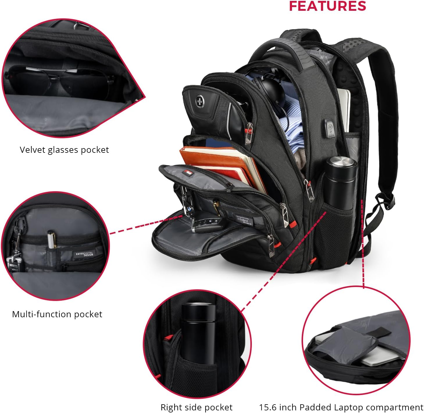 Swissdigital Design Travel Backpack for men, TSA Friendly USB Charging RFID Protection Business Backpack Fits 15.6" Laptops Black | J14-BR