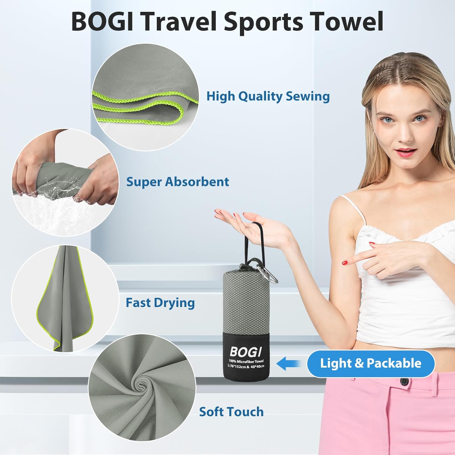 - Bonus a Gift Bag & Carabiner: BOGI towel comes with a breathable gift bag, easy to carry and hanging loop to protect your towel. When you go out or travel, you can put it into the bag. Our microfiber travel towel set is so compact and space saving. The snap loop is great for hanging up. And without worrying about it flying away. Daily lifestyle, less trouble for travel. A love gift for your family, lover and friends. If you have any questions about our towels, please feel free to contact us.