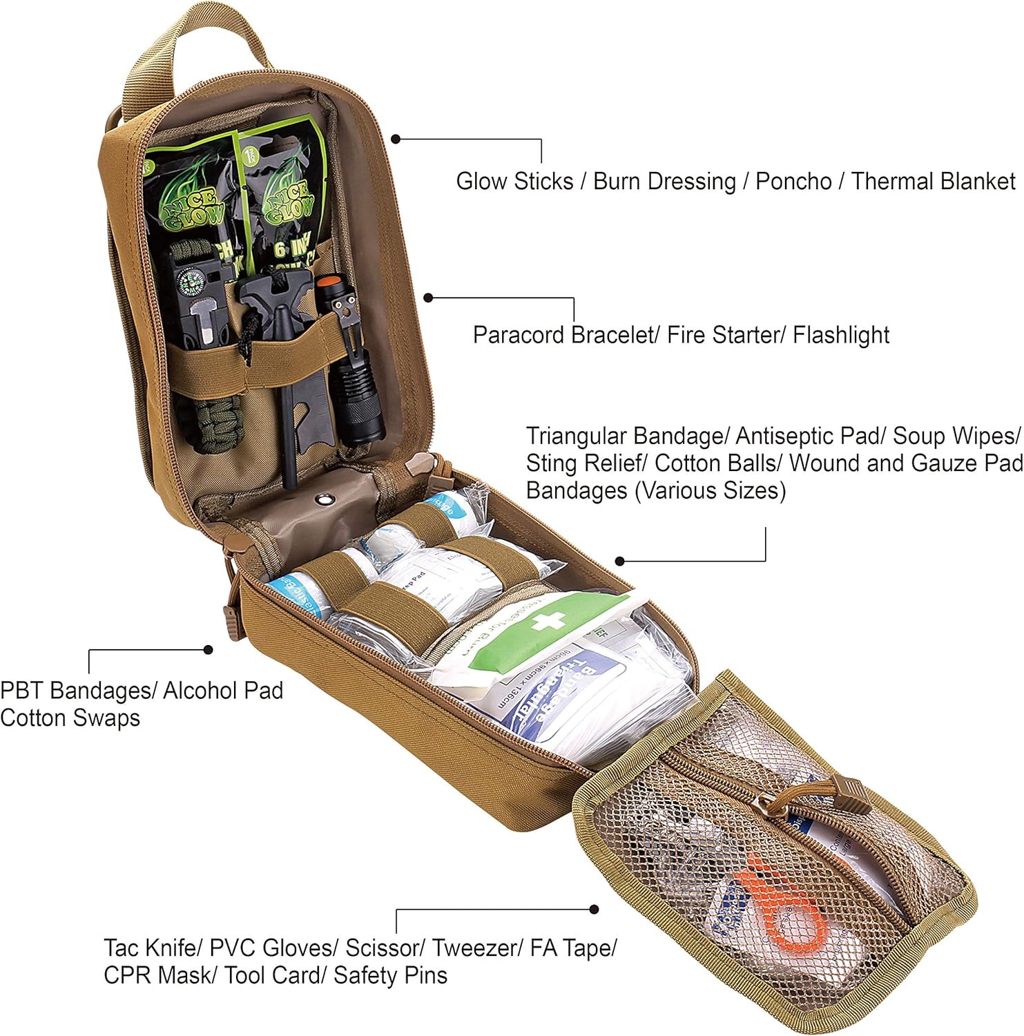 - ✅【Molle EMT Pouch, Durable, Portable, and Water-Resistant】The military grade bag was made from 1000D water-resistant nylon, it offers three large compartments and many straps to get your supplies organized. The overall dimension of the kit is 8’’ x 6.5’’ x 5’’. The kit can be attached to any molle system: backpack, vest, vehicle molle panel.