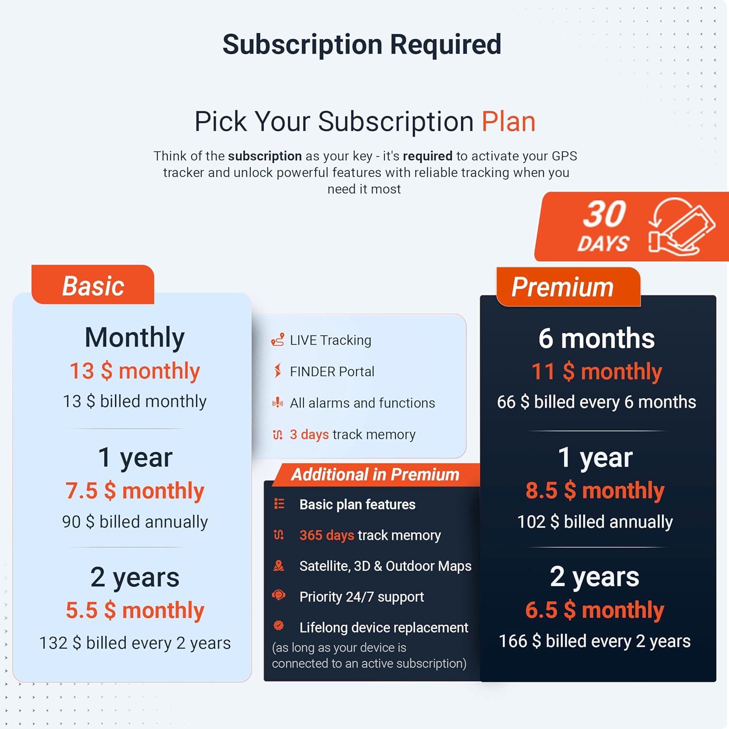 - SUBSCRIPTION REQUIRED: Includes a SIM card and offers a lifelong device replacement, along with 24/7 customer support in multiple languages. Control your locators with our free app compatible with Android and iOS and share it with the whole family. Choose between the Premium or Basic plans, with options from monthly to every 2 years, from $5.50 per month, with payment frequency depending on the duration of the subscription. See pricing details in images.