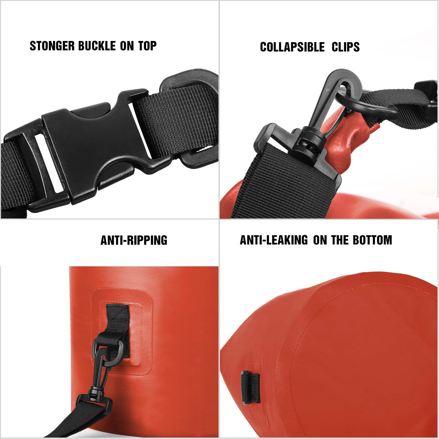 - VERSATILE AND DURABLE: You can leave the dry bag float on the water during river trip or other water sporting, no more worry about your items getting wet. The buckle and D-rings are upgraded with POM material, stronger than other traditional buckle. It will not break for frequent use