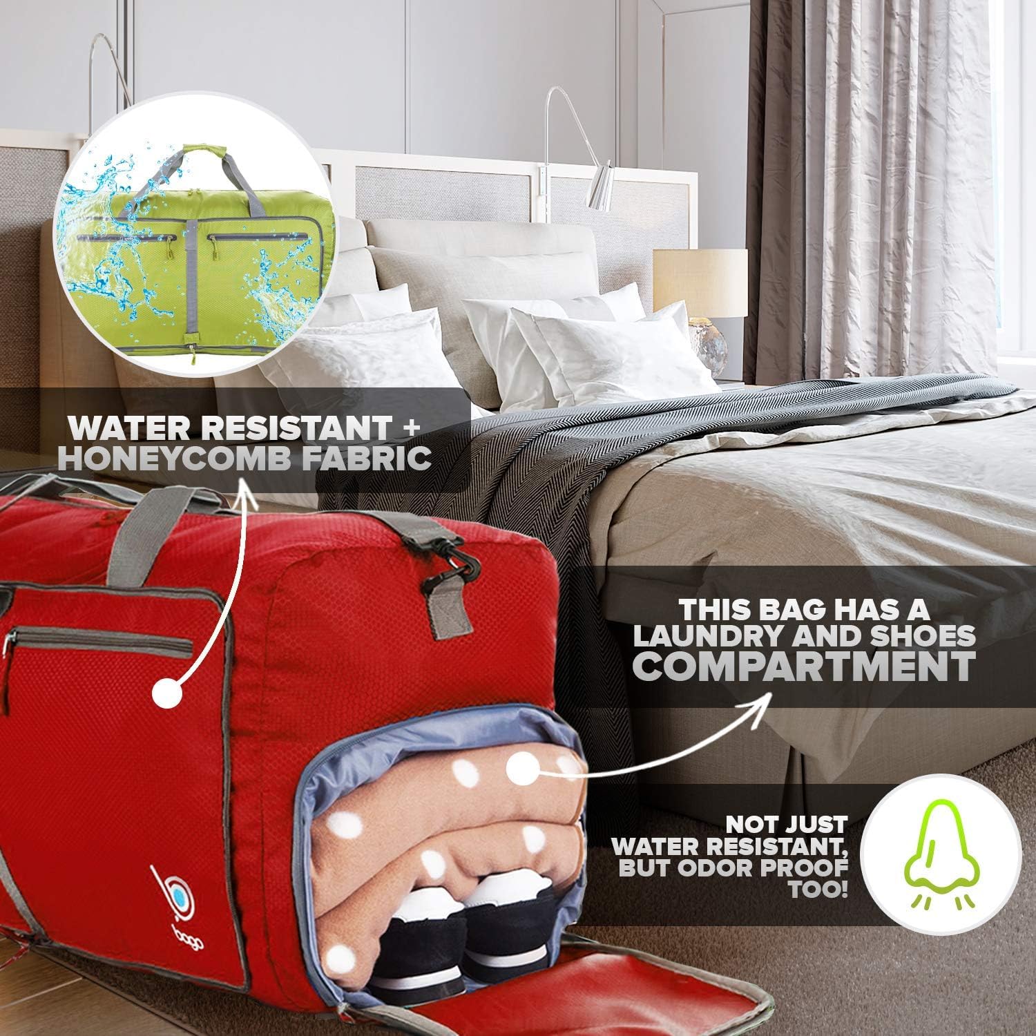 Bago Large Foldable Duffel Bags for Traveling Women & Men - 100L Packable Duffle Bag for Travel with Shoe Compartment - Water Repellant, Heavy Duty, Lightweight Folding & Collapsible (Red)