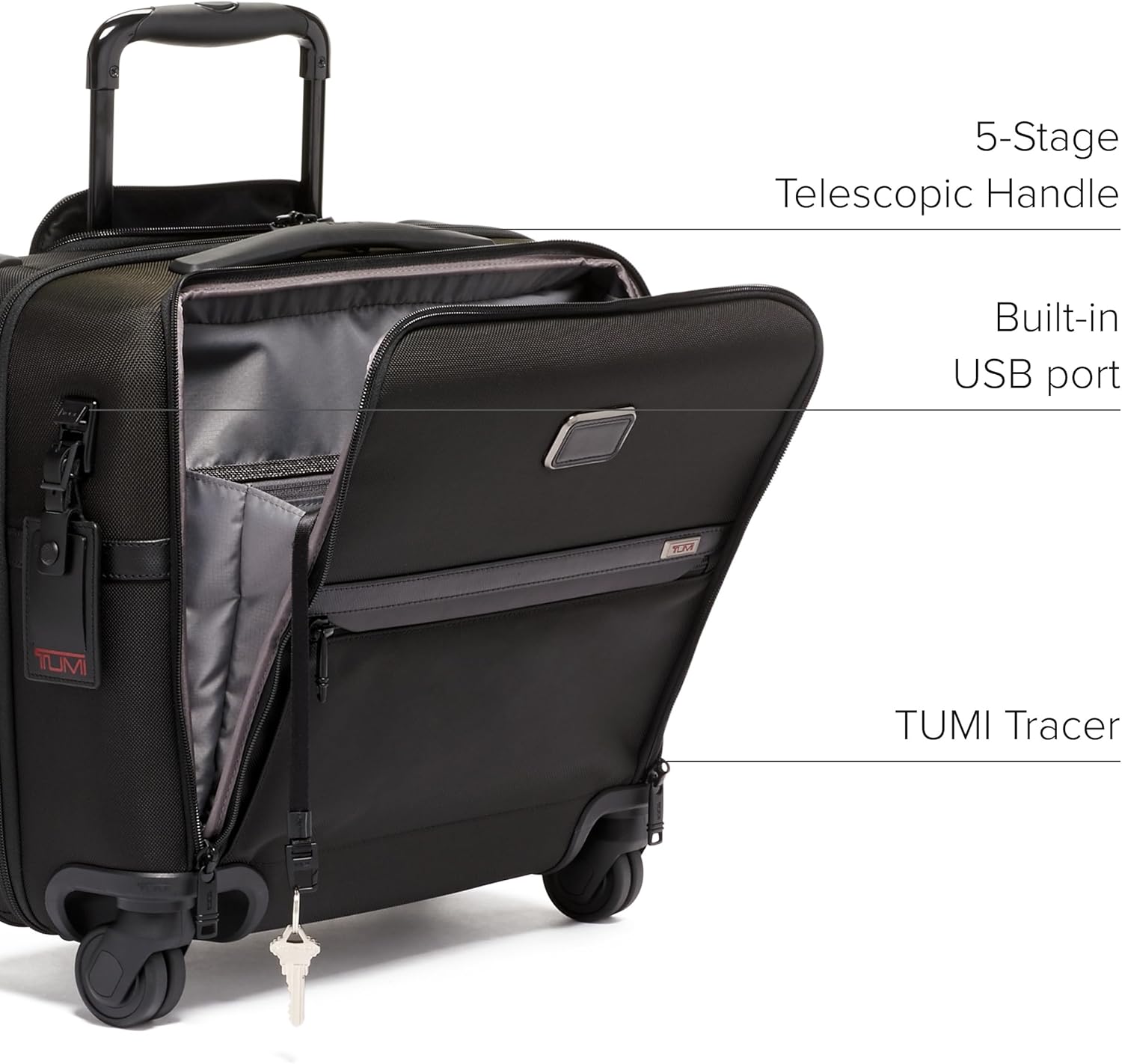 - Rolling Briefcase with Compact Design: This TUMI Compact 4 Wheeled Brief boasts a versatile, compact design that makes it the ideal carry on bag for business travelers