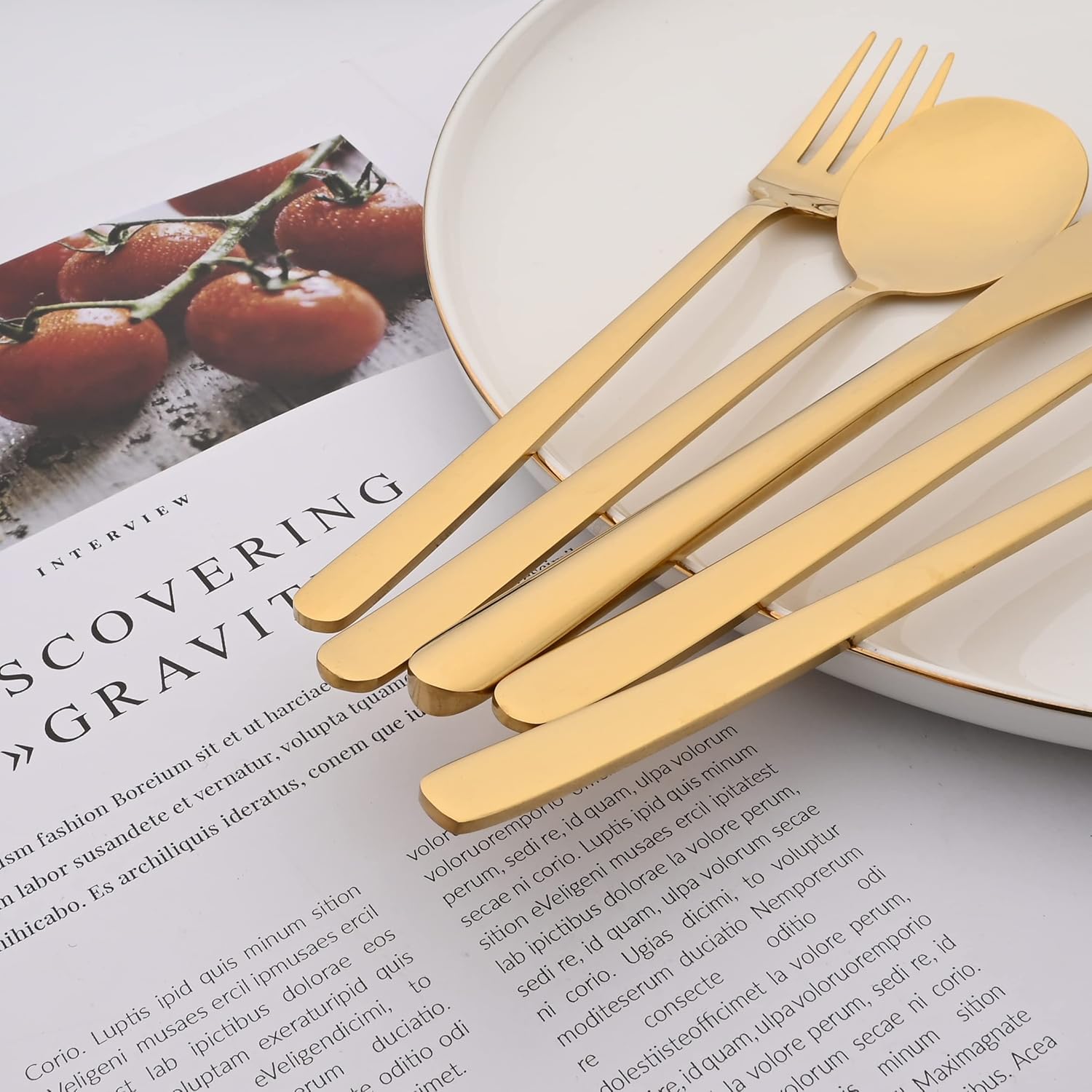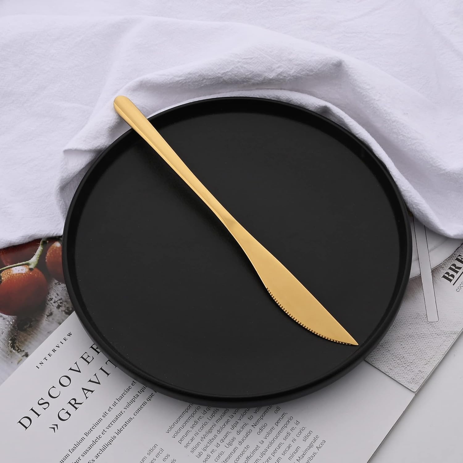 - Premium Quality: Exquisite in both craftsmanship and material. These plated flatware set, constructed by high quality food grade stainless steel, which is healthy and durable for daily use, is finely made, all edges and every detail parts delicately matte and handled. Touch smooth and decent no matter the spoon on your lips or the handle in your hands.
