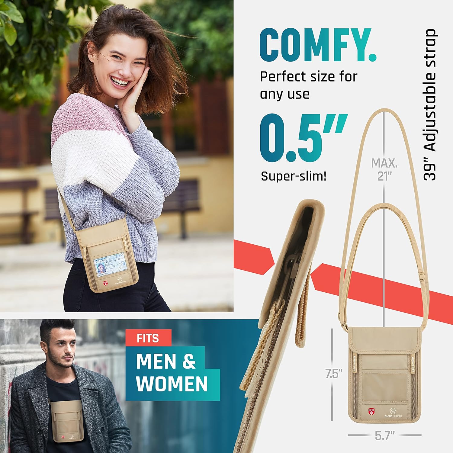 Alpha Keeper Neck Wallet, Travel Pouch For Passport Holder And Documents, RFID Blocking, Beige, Unisex Adult, Travelers, Adults