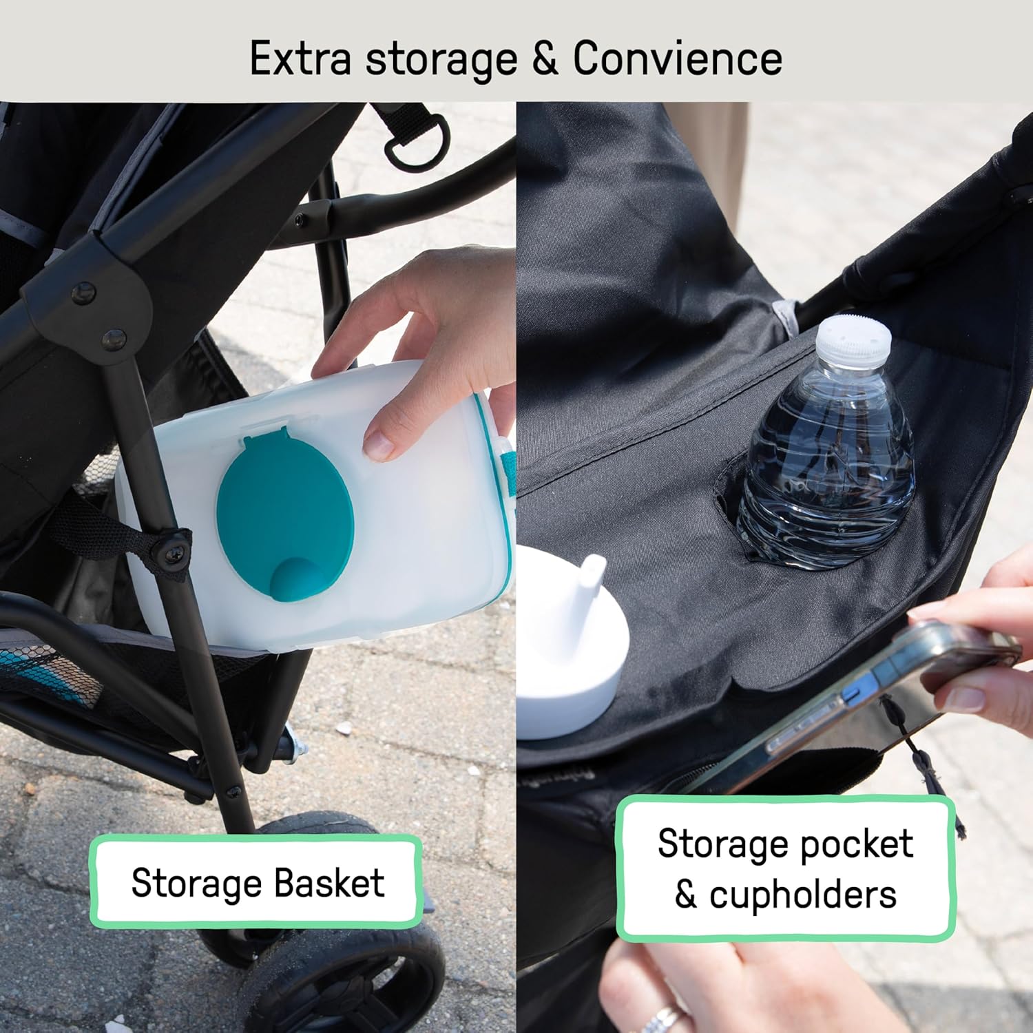 - Includes 2 cup holders, rear storage pocket, cushioned handlebars, and a large, easy-access storage basket so you won't have to leave anything at home