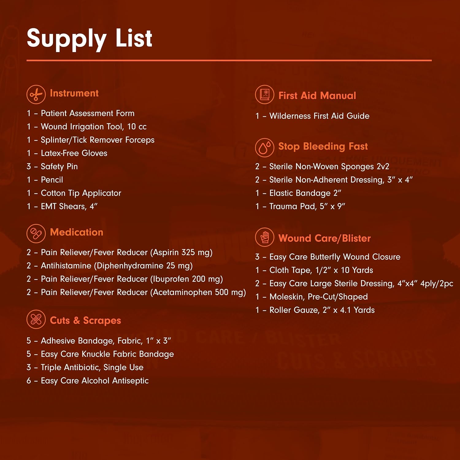 - Sportsman 200 Kit: Accommodates up to 4 people for up to 4 days, ensuring comprehensive first aid while camping, hunting, or fishing