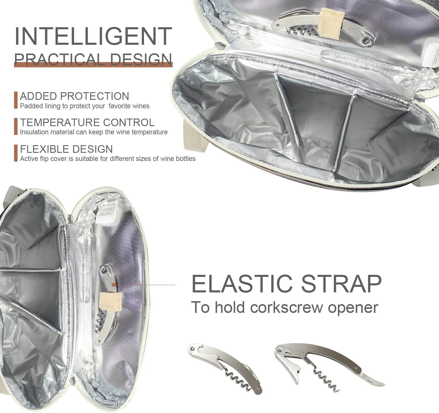 - Portable & smart design - wine tote includes a self-storing wine key, has both a handle and adjustable shoulder strap, you can easily tote your wine carrier by the pu leather handle or the shoulder strap, 2 way separating zipper and stainless steel clasp.