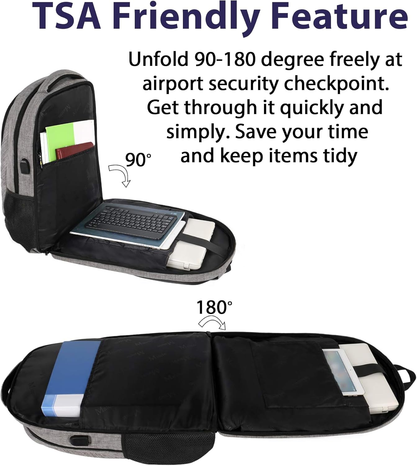 - TSA Approved Backpack: Laptop compartments' tsa function is designed for airplane flight travel. The laptop travel backpack can unfold 90 to 180 degrees, making the laptop bookbag get through airport security checkpoint more easily and quickly. This 17 inch laptop backpack is large and smart enough for college school, daily office work, weekend getaway, overnight trip, travel
