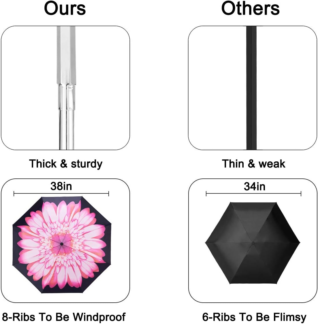 - 【UPGRADE STURDY & WINDPROOF UMBRELLA CONSTRUCTION】- Unlike other mini umbrellas made of 6 ribs,our compact mini umbrella is made of 8 ribs.And the shaft is designed thicker than other ordinary 6 or 8 ribs umbrellas.So,this compact travel umbrella can withstand the normal heavy wind/rain and make sure that it won't easily to flip out inside easily.