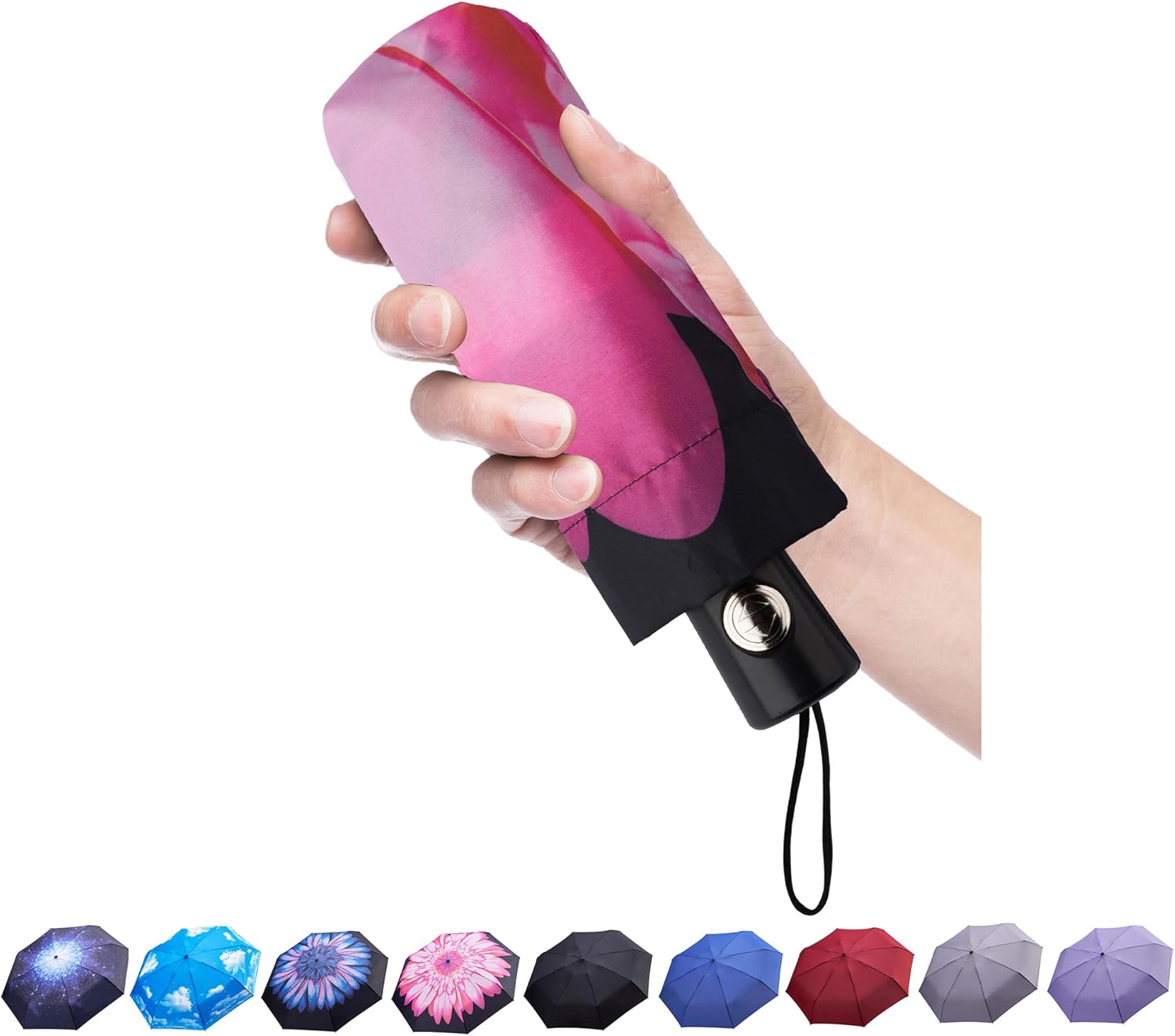 - 【UPGRADED SMALL AUTOMATIC UMBRELLA】- Unlike other mini manual umbrellas are so difficult to open/closed as the reviews customer left,this Goothdurs folding umbrella is auto open/close.You don't have to struggle with the closing your umbrella when getting into a car,building or tent.It needs just less than one second to open and close the umbrella with the auto button.