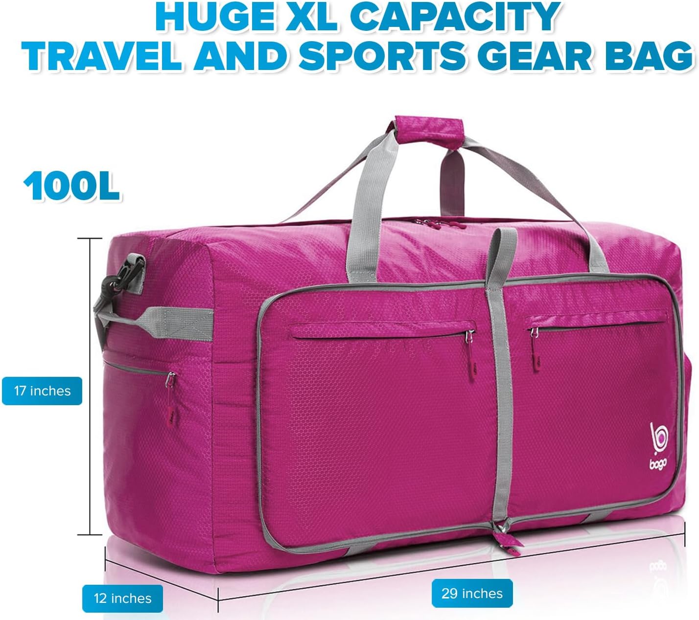 Bago Large Foldable Duffel Bags for Traveling Women & Men - 100L Packable Duffle Bag for Travel with Shoe Compartment - Water Repellant, Heavy Duty, Lightweight Folding & Collapsible (Pink)