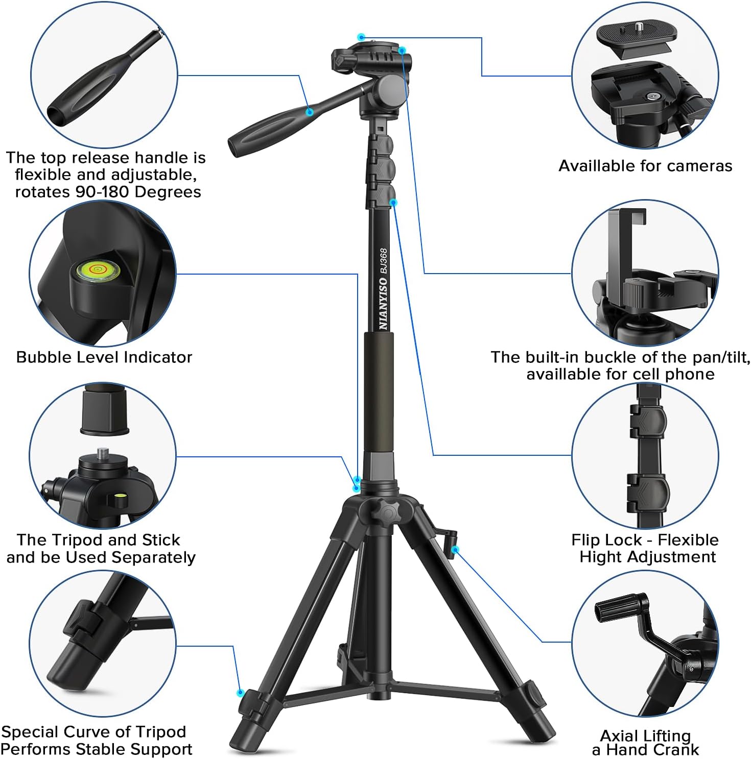 - 【Multifunctional Three-way Pan/Tilt】 360°rotating, adjustable-angle pan/tilt allows you to take panoramic photos/videos at will. Camera tripod has a 360° rotation function, allowing tilt and rotation movements; portrait or landscape options. NIANYISO Tripod has an exclusive patent and is equipped with a quick release plate, It can convert a camera tripod to a phone tripod without installing anything. Simply pull out the built-in buckle of the pan/tilt, it can be used as phone tripod