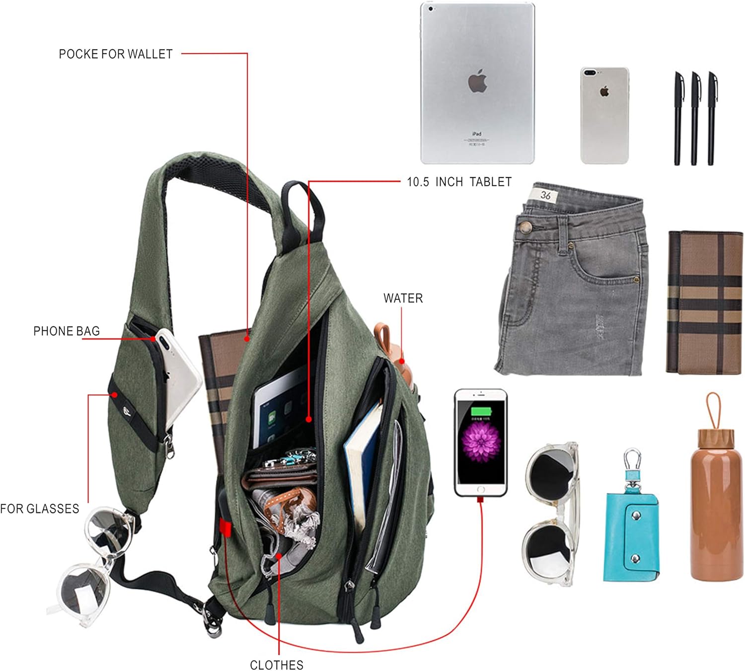 - USB CHARGING PORT (without portable charger) - Implant USB cable. You may charge your mobile phone easily with the USB charing port (using the implanted USB cable connect your potable power supply). A Mobile Phone Pocket in shoulder strap makes you convenient for charging and listening while walking.