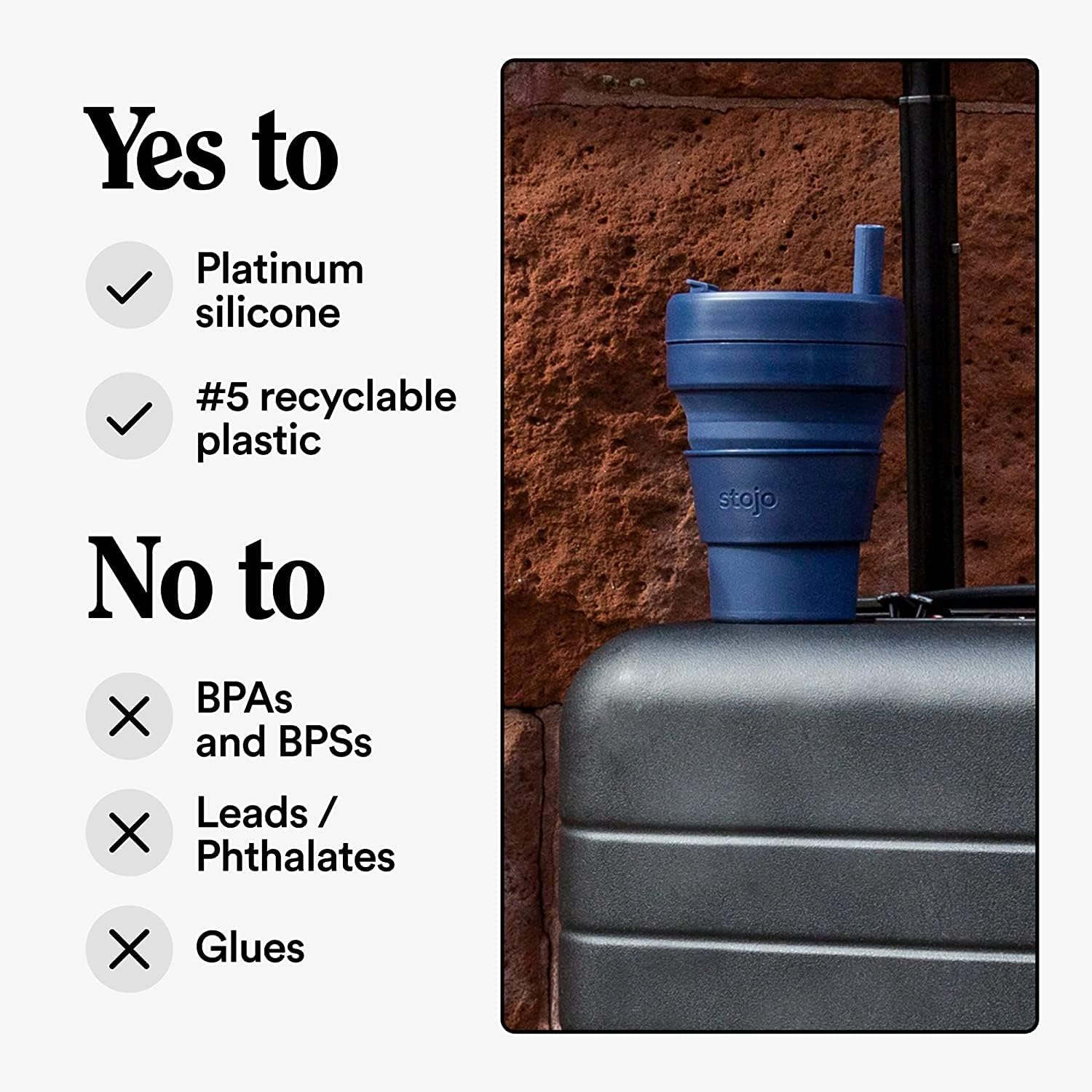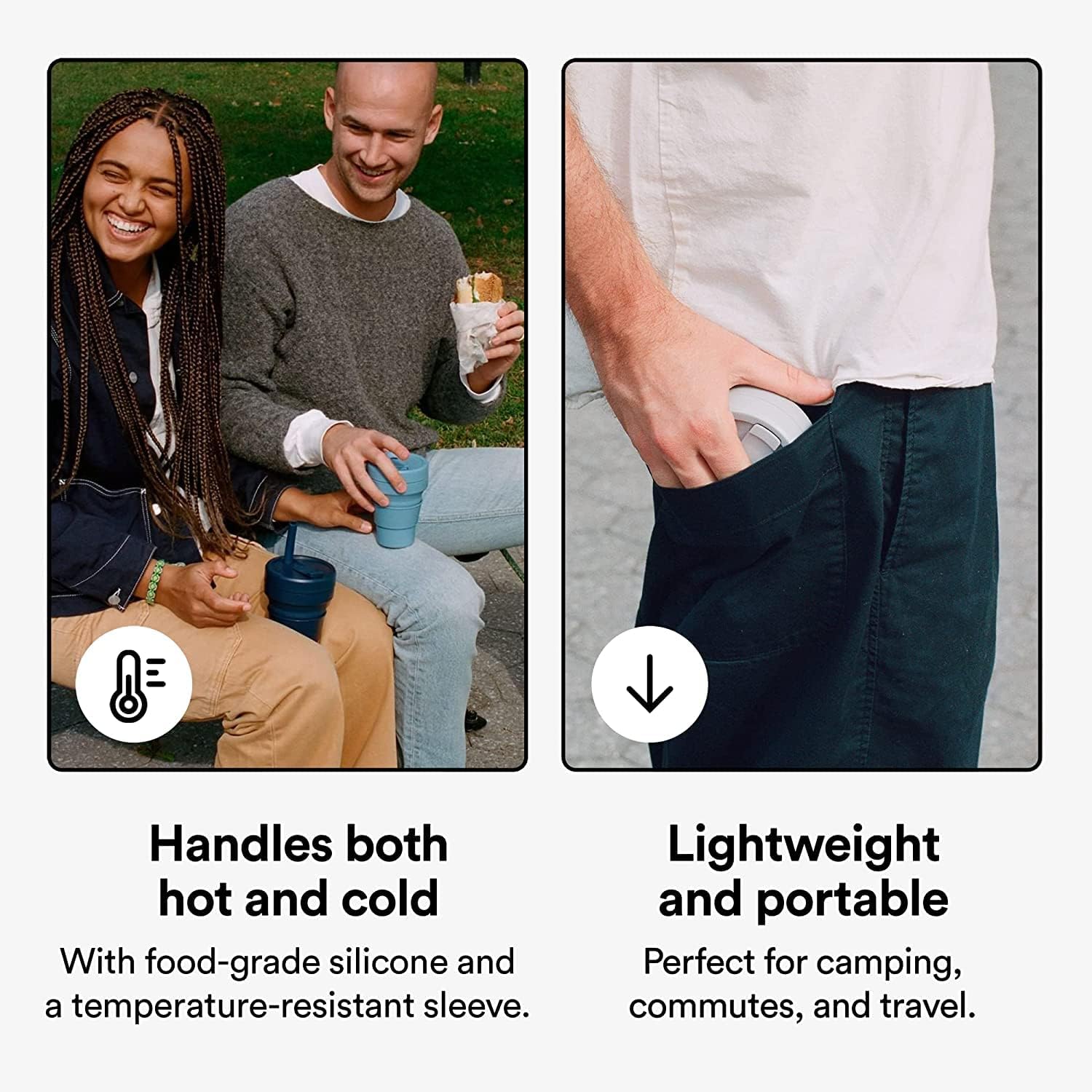 - Collapsible cup: It’s literally never been easier (or more fun) to bring your own reusable cup! This compact cup collapses down to just 2 inches. Whether you’re sipping coffee or a smoothie, the 12 oz Stojo is perfectly portable for your commute, camping trips, tea at home, and travels. When you’re done, simply remove the heat sleeve, open the tab, and collapse it down. Leak-proof, includes a straw, fits standard cupholders, and get a load of that Aquamarine Blue color!
