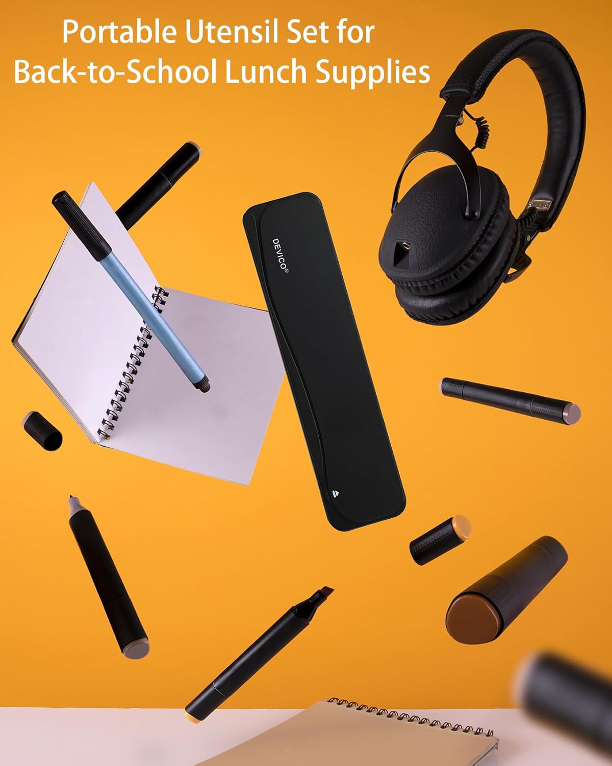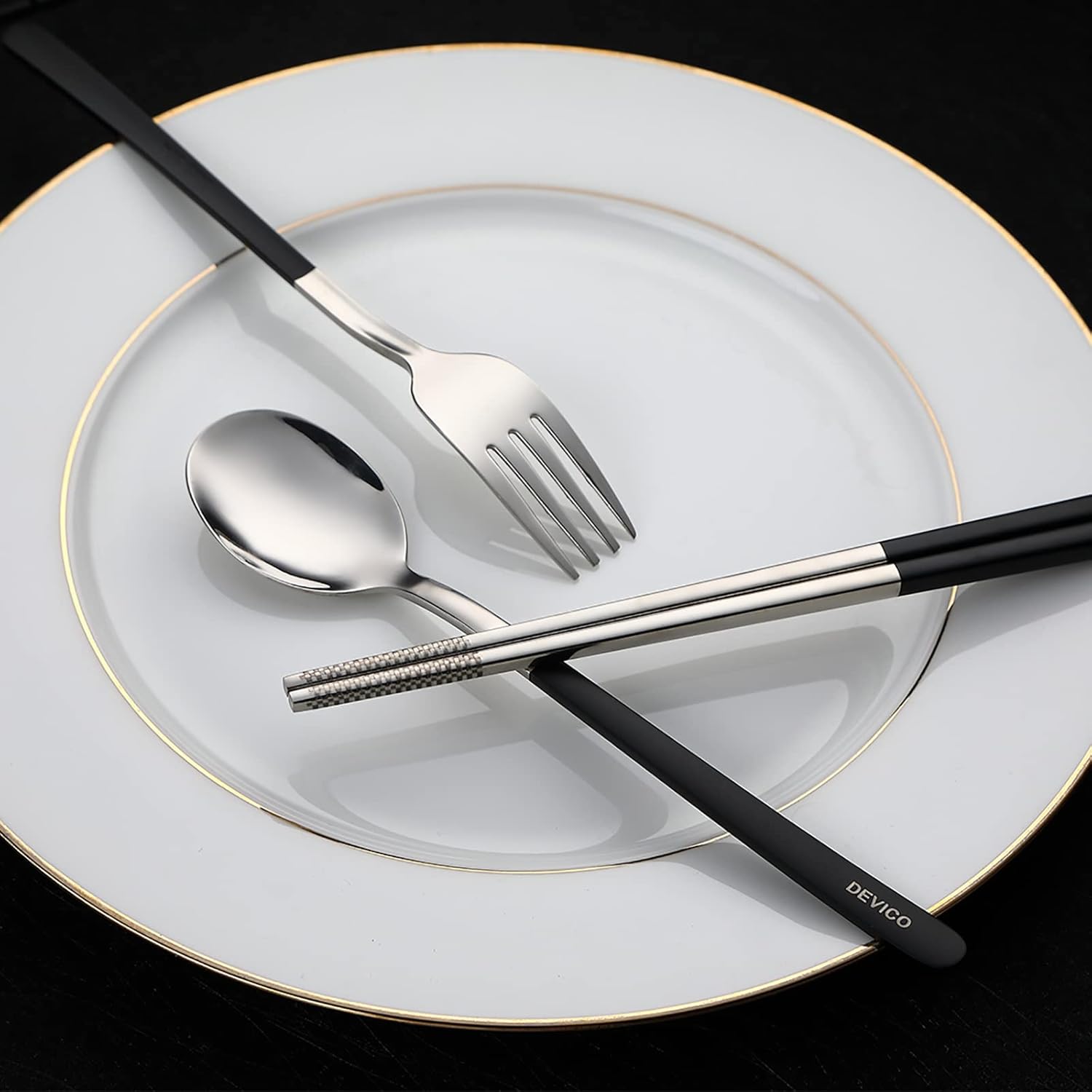 DEVICO Travel Utensils, 18/8 Stainless Steel 4pcs Cutlery Set Portable Camp Reusable Flatware Silverware, Include Fork Spoon Chopsticks with Case (Black)