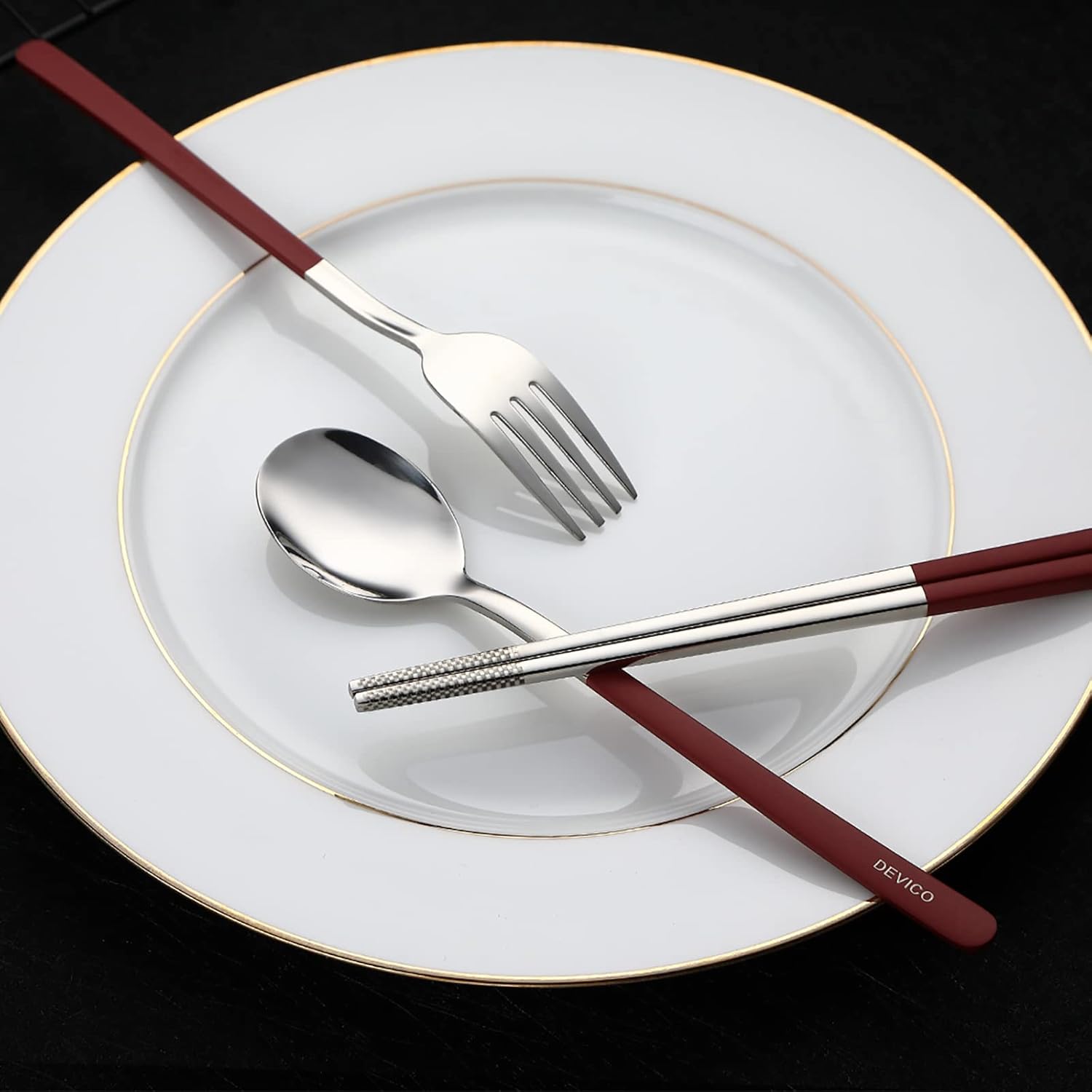 DEVICO Travel Utensils, 18/8 Stainless Steel 4pcs Cutlery Set Portable Camp Reusable Flatware Silverware, Include Fork Spoon Chopsticks with Case (Red)