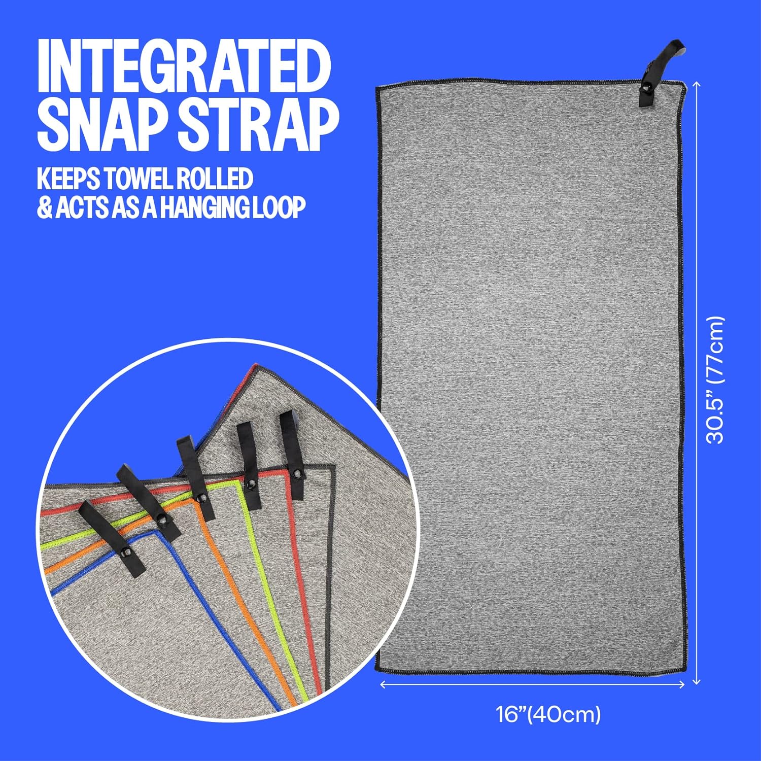 - ULTRA COMPACT, LIGHTWEIGHT, STAY CLEAN WITH HANGING LOOP: With an integrated snap strap closure that doubles as a hanging loop over the door, your backpack, or bottle. the large thin towel rolls up into a packable travel-friendly size. Perfect for anyone who travels light.