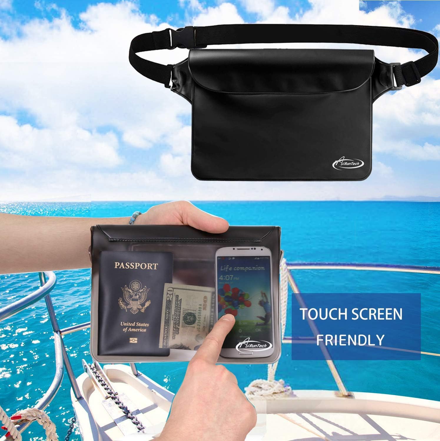 - Beach Gear: Spacious Design for Maximum Storage Measuring: 8.5 inch x 5.8 inch. AiRunTech waterproof bags are extra deluxe & spacious, holds a lot, fits all large Smartphones below 7 inches & Your cash, credit cards, wallet, and car keys, etc, and if you get air trapped in it, it’ll float too.