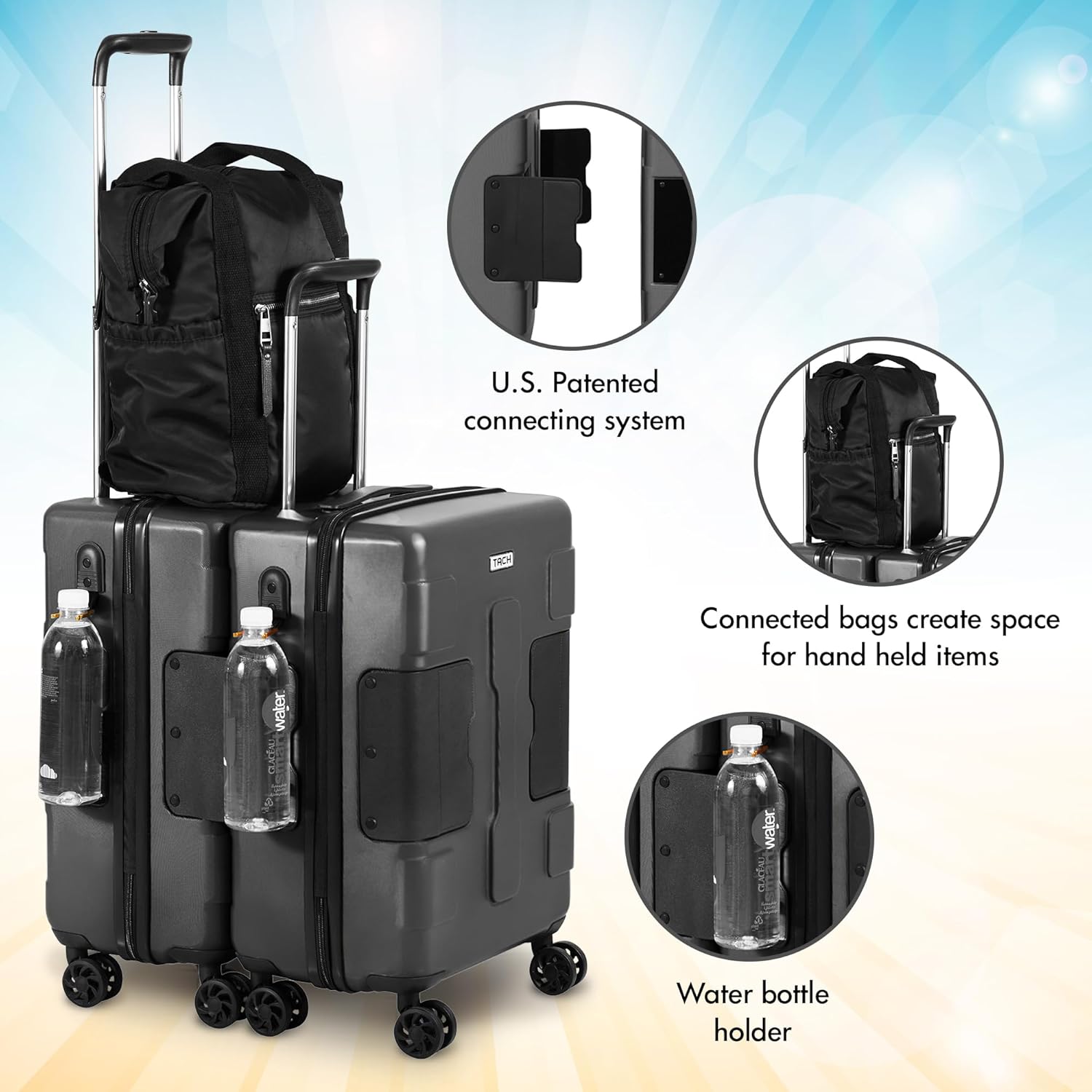 - EXTRA TOP STORAGE & ELECTRONIC CHARGING PORT - TACH connectable suit cases feature a flat top design for extra storage or seating. Conveniently store your personal item bag or other travel necessities right on top of your roller bag. TACH luggage carry ons also feature an external water bottle holder, 2 charger ports, and an additional pocket for your favorite power bank, so you can keep your devices powered up for those long travel days.