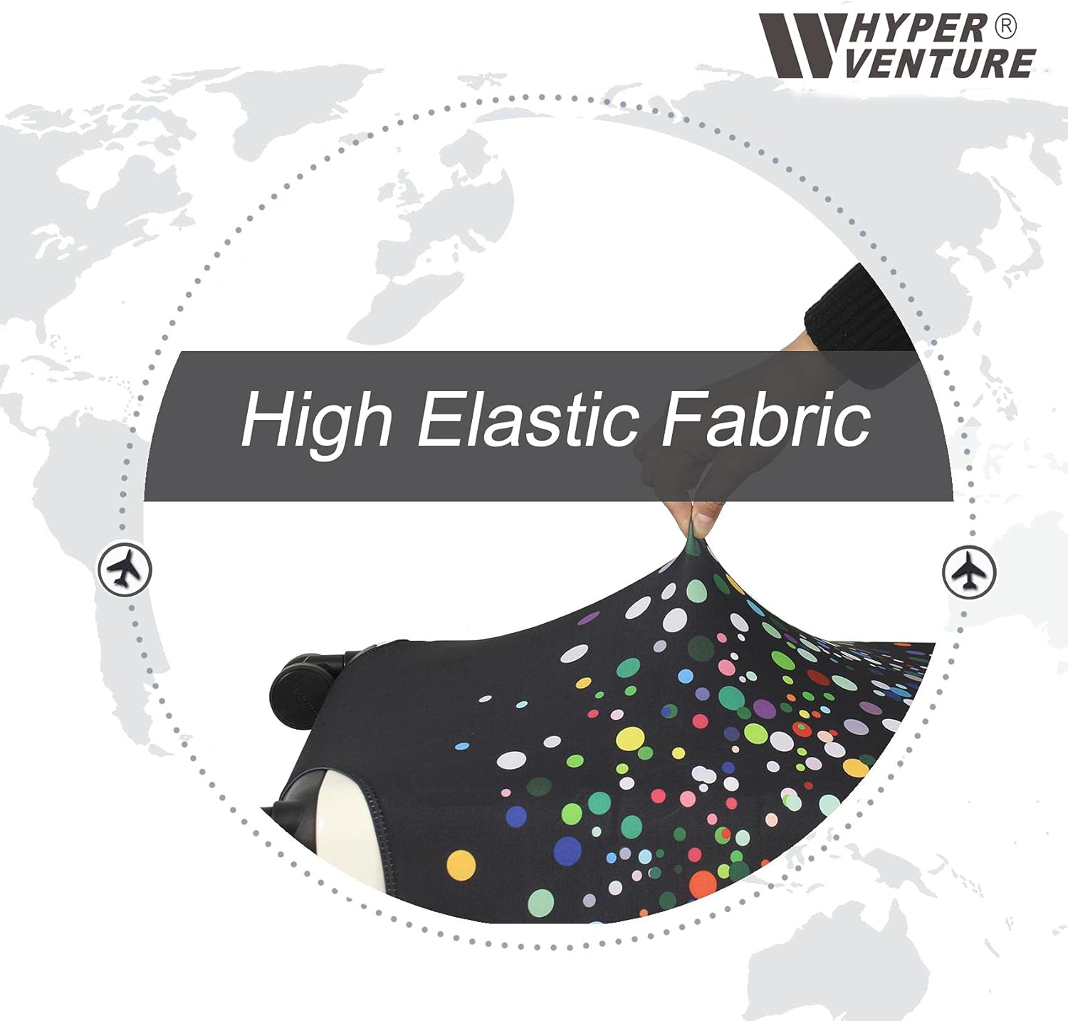 - HYEPR VENTURE luggage cover is made of 300 grams of elastic material, 15% spandex and 85% polyester fiber, designed to offer superior protection against scratches, dirt, and spills. This ensures your suitcase remains unblemished throughout your journey.