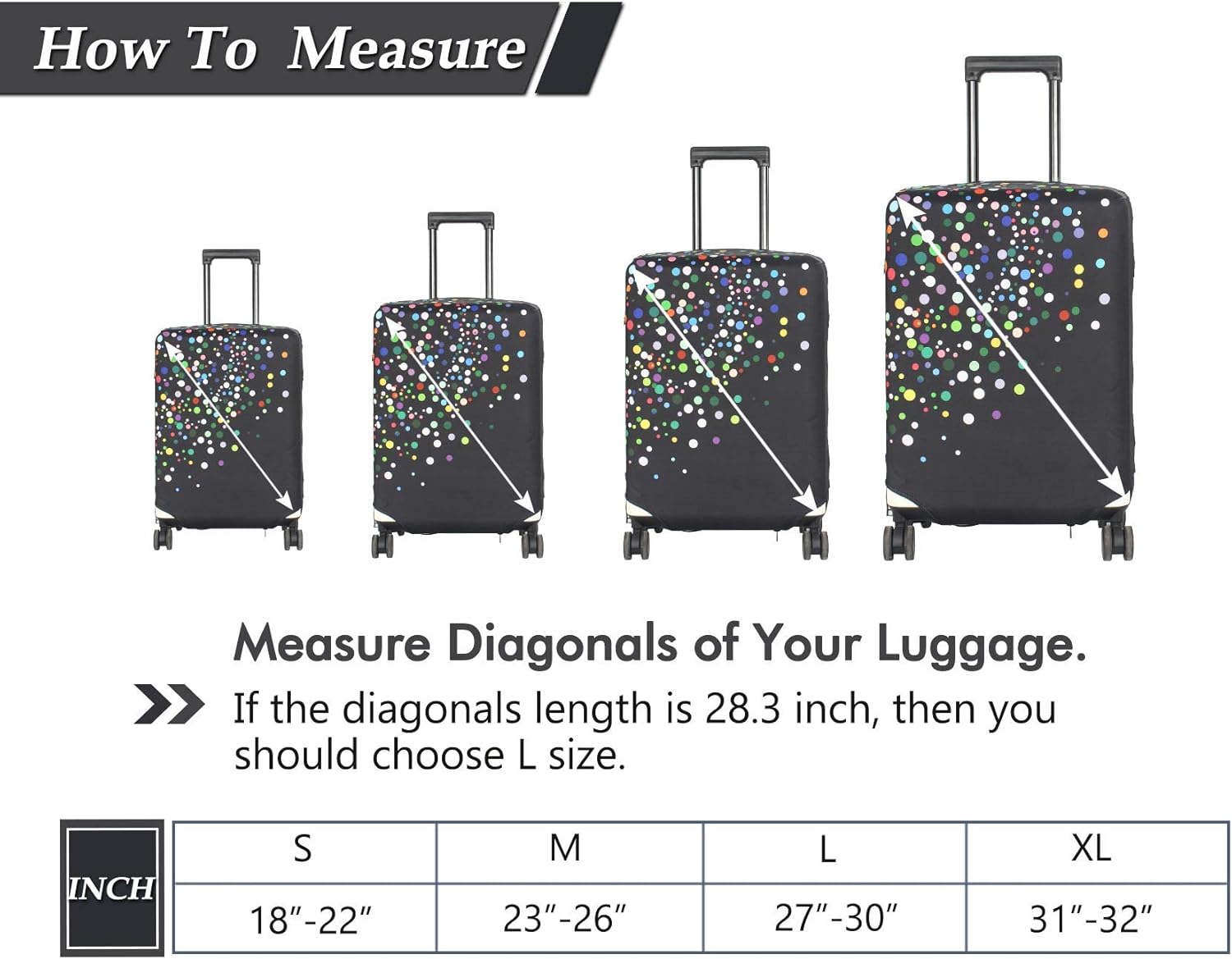 - Four sizes to fit almost any luggage: S: fits 18-22 inch luggage, M: fits 23-26 inch luggage, L: fits 27-30 inch luggage, XL: fits 31-32 inch luggage. Please measure your suitcase before purchasing. Only luggage cover, suitcase not included.