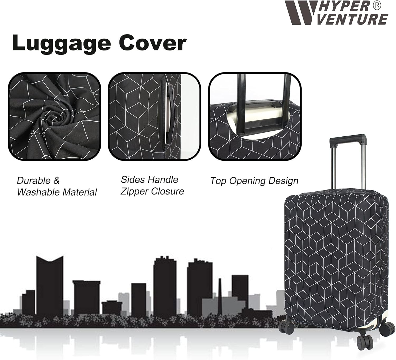 - HYEPR VENTURE luggage cover is made of 300 grams of elastic material, 15% spandex and 85% polyester fiber, designed to offer superior protection against scratches, dirt, and spills. This ensures your suitcase remains unblemished throughout your journey.