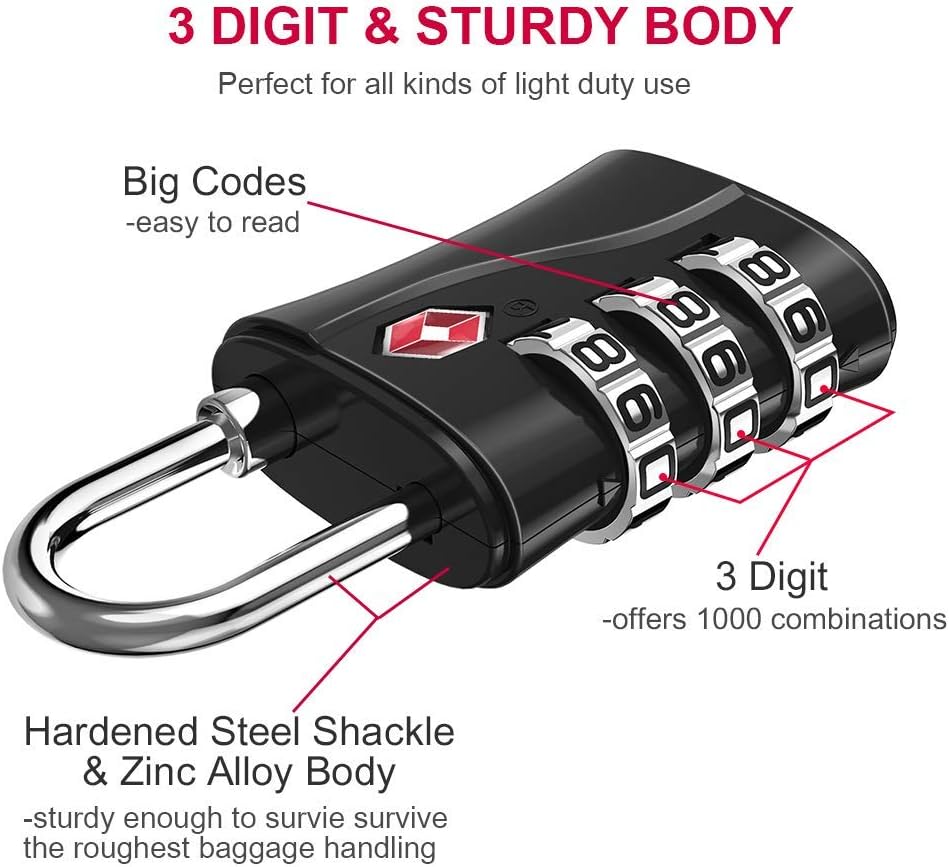 - ▶EASY TO USE: The resettable luggage locks TSA approved allow you to set you own combination with 1000 unique options. Simple 5 steps and instructions are included right at back of the package cardboard. Please note that NEVER forget your password or the luggage lock will be of no use.