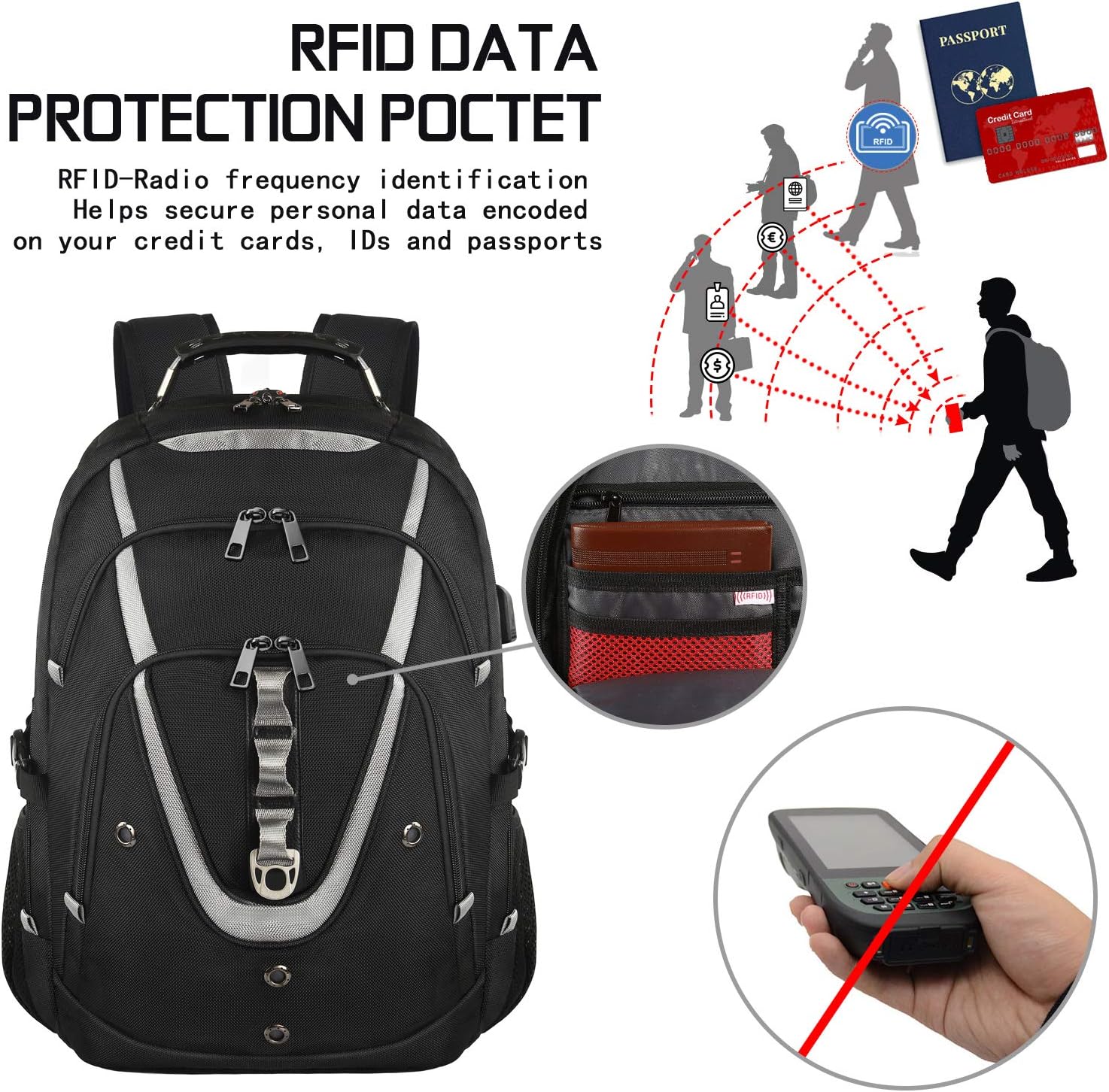 - RFID Backpack & Anti-Theft: The RFID pocket's radio frequency identification feature helps protect your personal data encoded on your credit card, ID card and passport, and the oversized anti-theft pocket on the back of the Travel Backpack makes it easy to keep your phone and wallet inside.