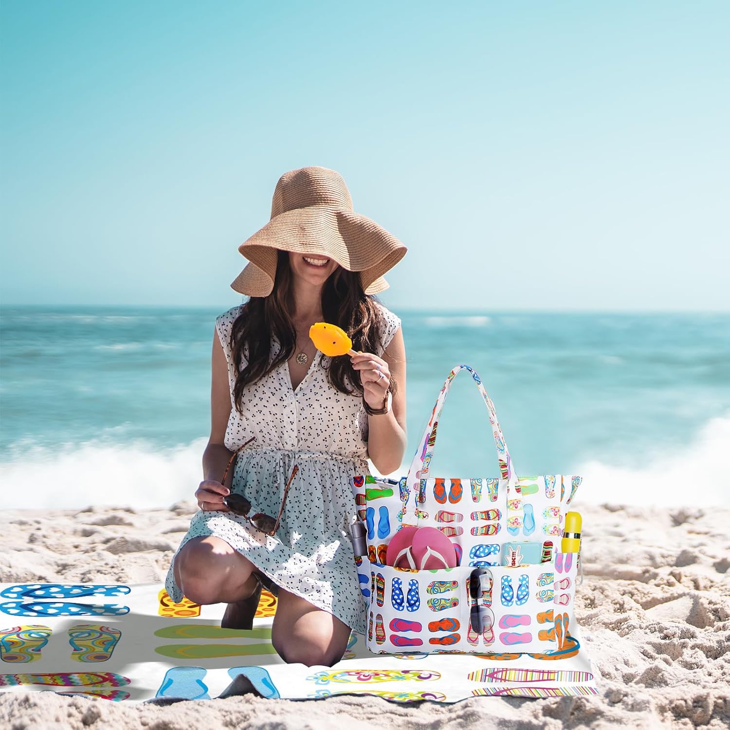 - Waterproof sandproof beach bag has tons of pockets and space for your towels, swim suits, flip flops, water bottles, glasses, sunblock, toys and any other things you'd like to take with you to the beach or pool, and interior pocket to place keys, your wallet or phone and other valuables