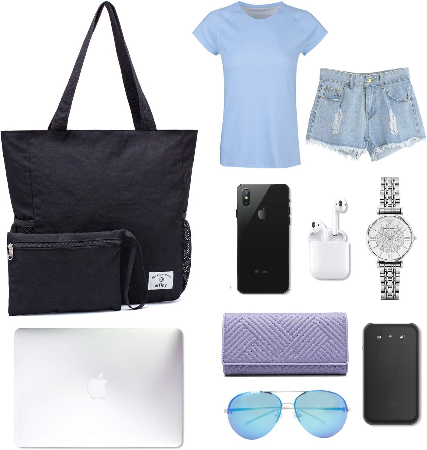 - ETidy large capacity travel waterproof tote bag with zippers. This is a 2-in-1 design bag. The large tote bag can be folded into a small bag, which is very convenient to carry.