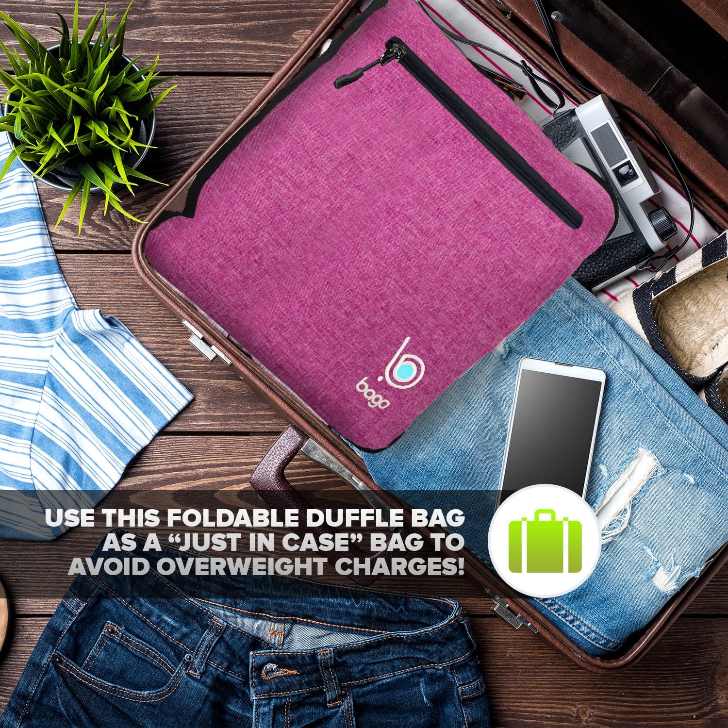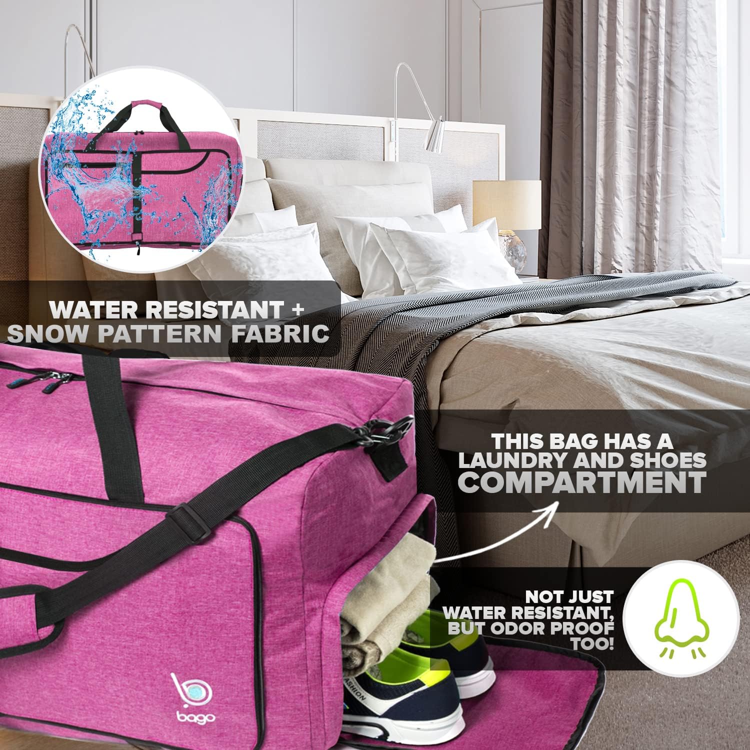 Bago Foldable Duffel Bags for Traveling Women & Men - 60L Medium Packable Duffle Bag for Travel with Shoe Compartment - Water Repellant, Heavy Duty, Lightweight Folding & Collapsible (SnowPink)