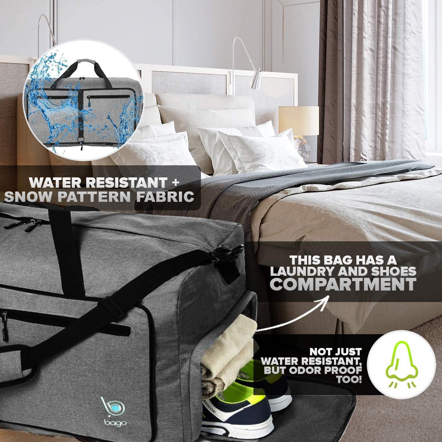 Bago Large Foldable Duffel Bags for Traveling Women & Men - 80L Packable Duffle Bag for Travel with Shoe Compartment - Water Repellant, Heavy Duty, Lightweight Folding & Collapsible (SnowBlack)