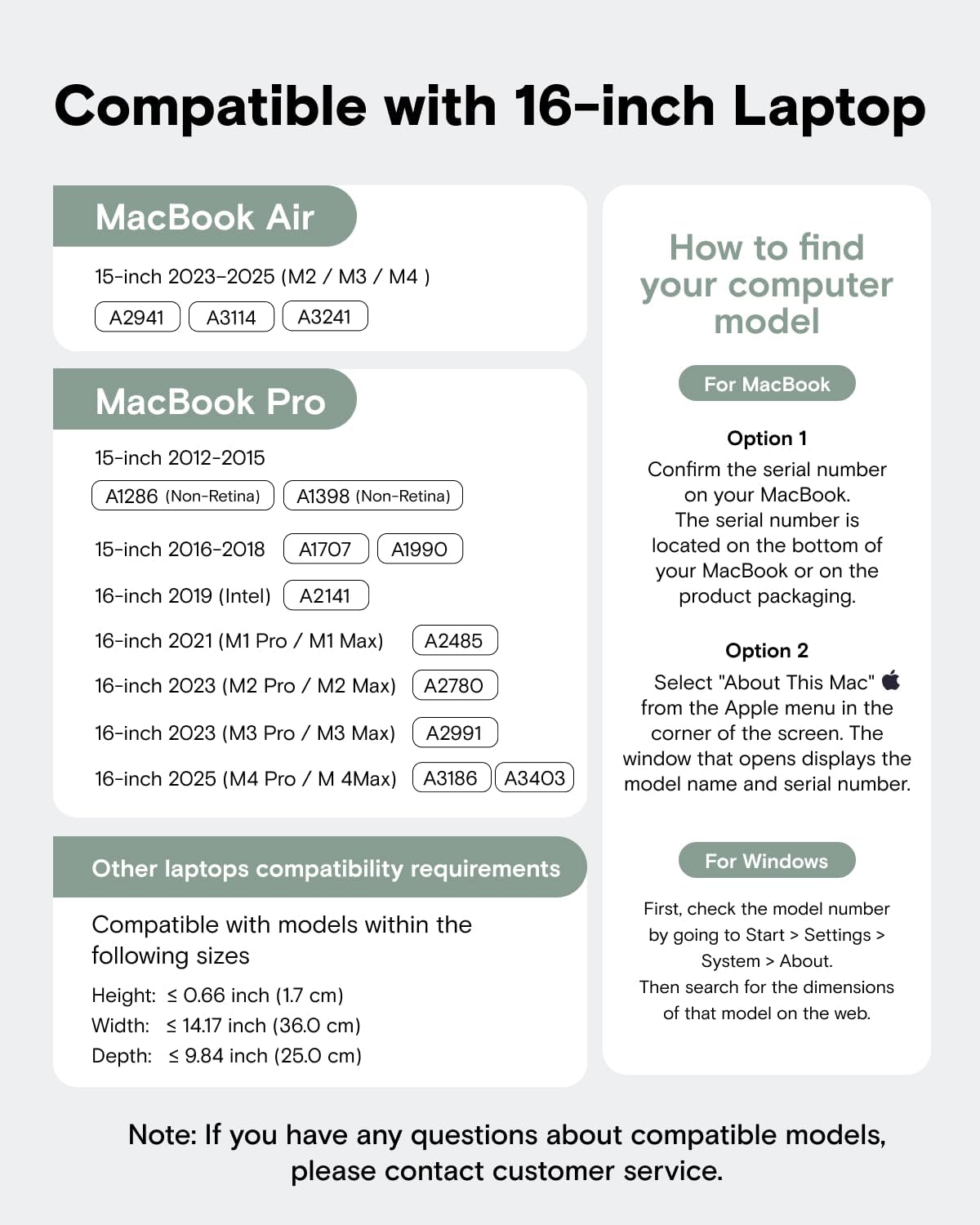 - Compatibility: Designed for 16 inch laptops. Laptop sleeve dimensions: 15.8 x 10.5 inch, Maximum compatible size: 14 x 9.8 x 0.7 inch. Laptop sleeve Precisely fits MacBook Air 15-in.(M2/M3/M4, 2023-2025), MacBook Pro 16-in.(M4 Pro/M4 Max, 2025), MacBook Pro 16-in.(M3 Pro/M3 Max, 2023), MacBook Pro 16-in.(M2 Pro/M2 Max, 2023), MacBook Pro 16-in.(M1 Pro/M1 Max, 2021), MacBook Pro 16-in.(intel, 2019), MacBook Pro 15-in (2016-2018), MacBook Pro 15-in (2012-2015)
