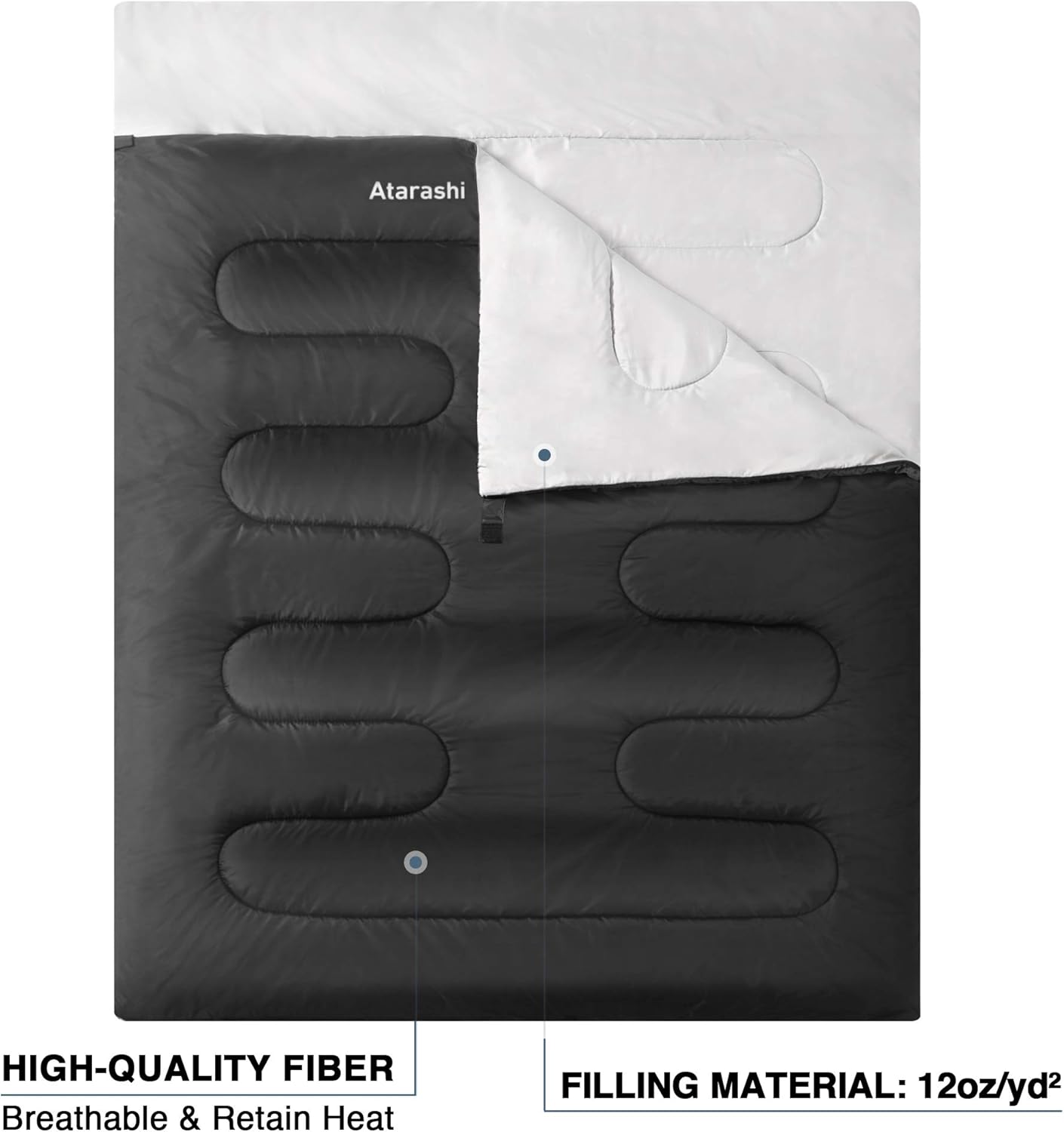 - SIZE & FILL - XXLarge 2 Person sleeping bag measures 59" by 87", fits most adults or kids up to 5'11" tall; The sleep bag with 12oz/yd² polyester insulation. The filling material is 400GSM, temperature rating 32-77°F(0-25°C), warm and comfortable, fits for 3-4 seasons camping & outdoors; Weight:6.9 lb