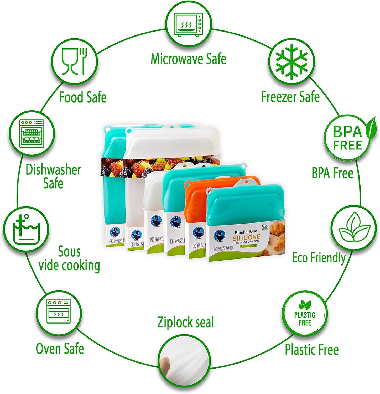 - 🌱 Oven / Microwave and Freezer safe – These food-grade & and BPA-free reusable food storage bags are durable, healthy, and odorless. It is dishwasher safe (either on the top or the bottom rack), freezer safe, and oven safe up to 400 F (200 C). To avoid rapid pressure buildup, keep bags slightly open when heating in the microwave or the oven.