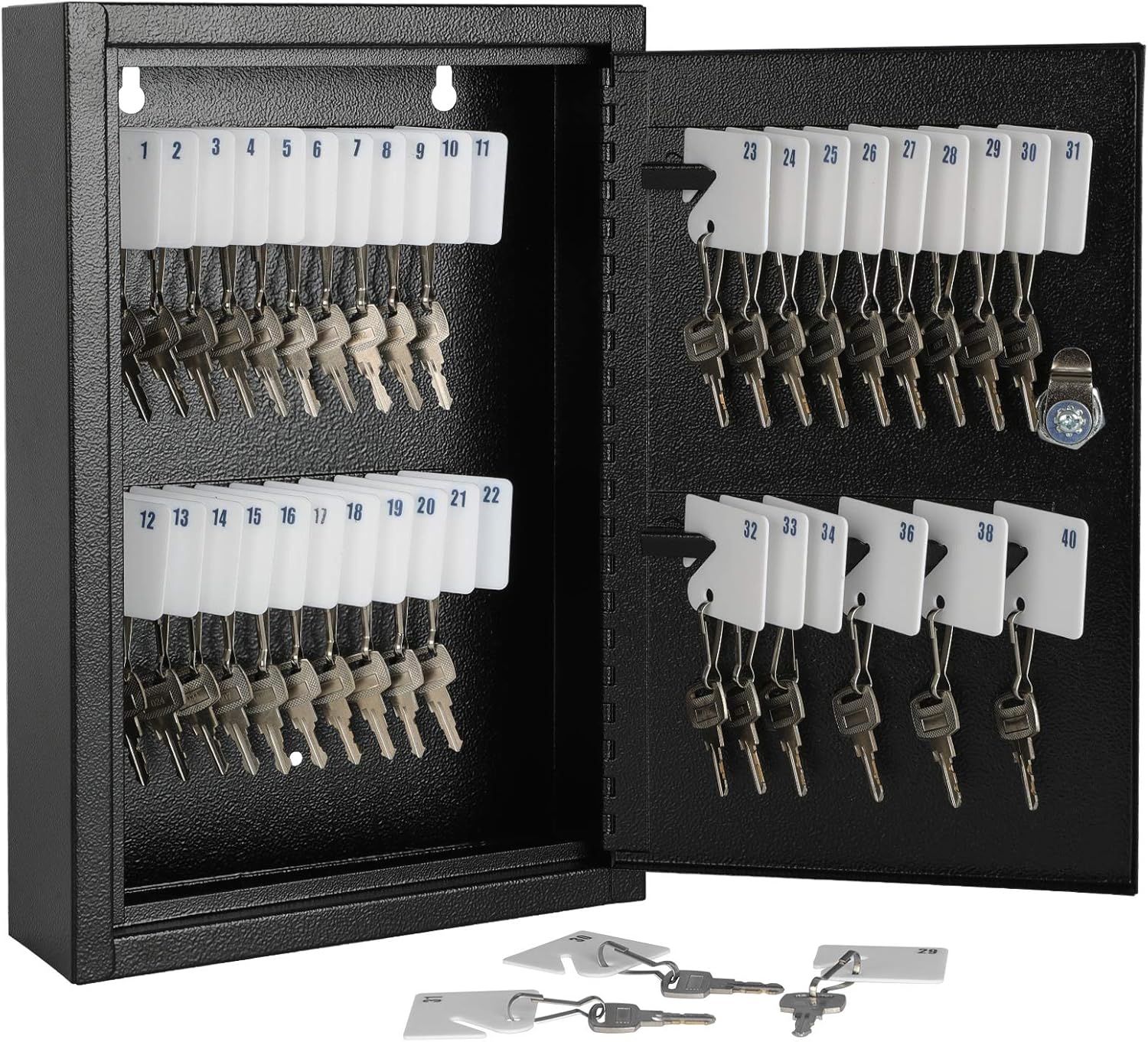KYODOLED Key Storage Lock Box Wall Mount, Locking 40 Key Cabinet Holder Box with Key Lock, Hooks & Labels, 2.5" D x 8.1" W x 12.1" H