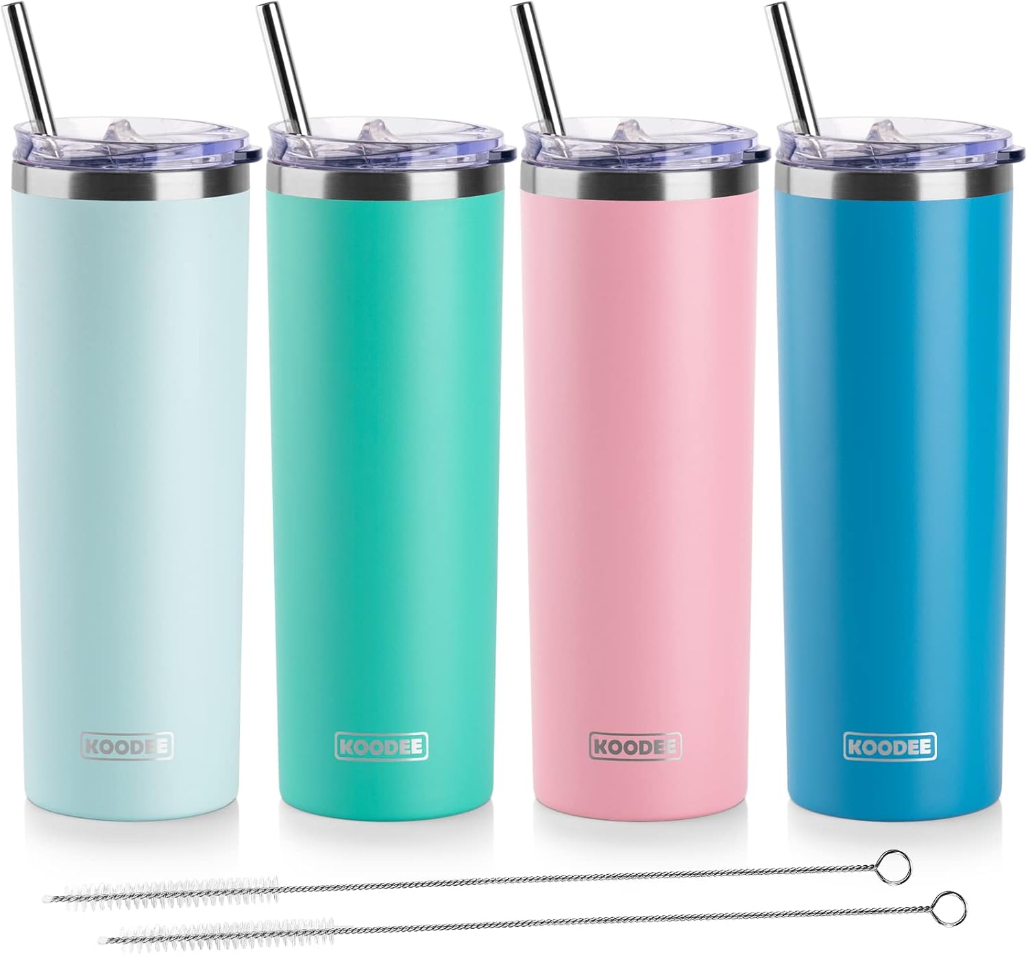 koodee 20 oz Stainless Steel Skinny Tumbler(4 Pack) Double Wall Insulated Water Tumbler Cup with Lids, Straws and Straw Brushe(Baby Blue/Pink/Sky Blue/Teal)