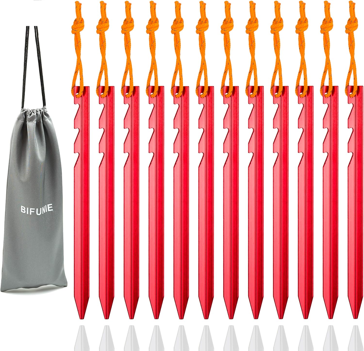- Package Included:: 12Pcs tent pegs with reflective pull cords + 1pcs carrying pouch;