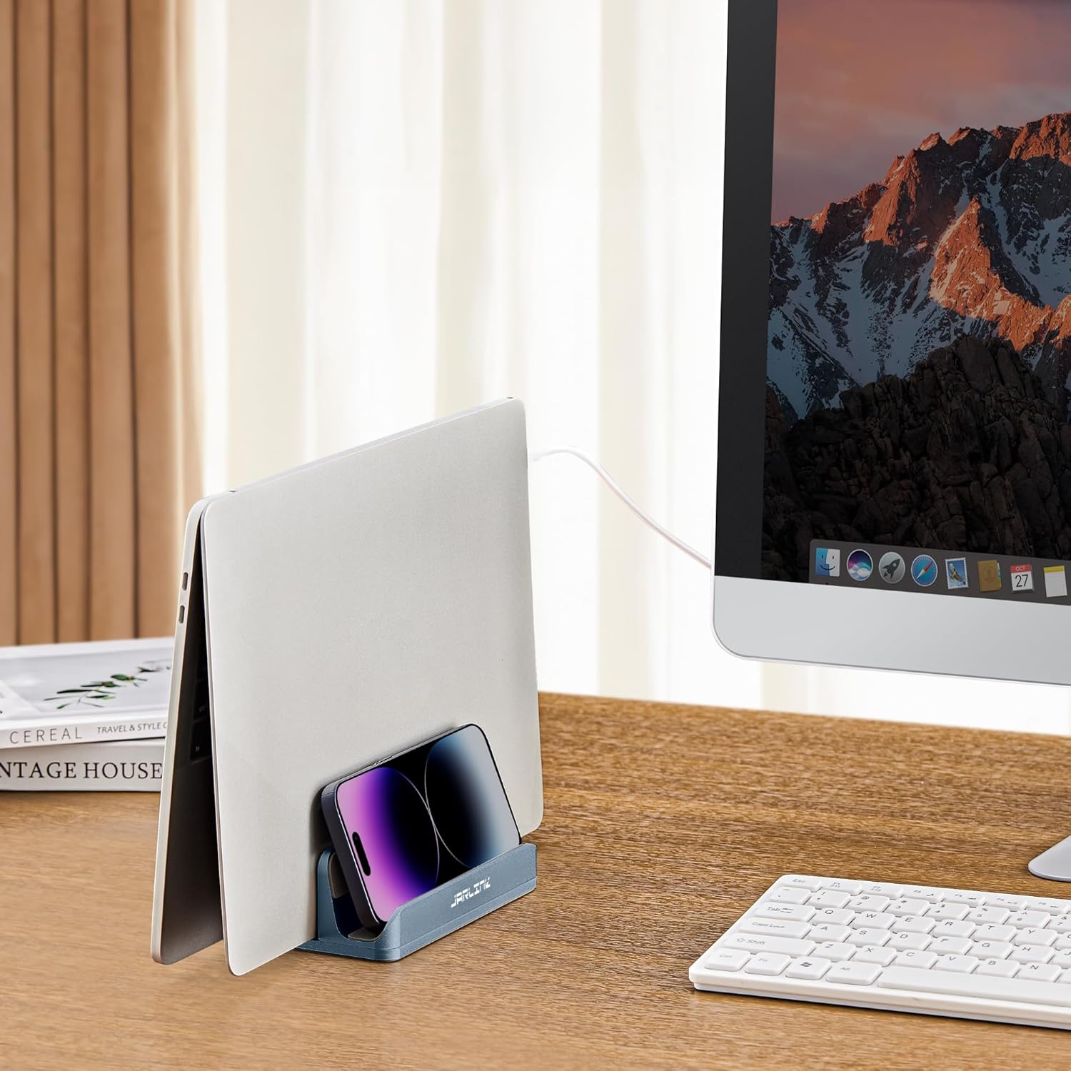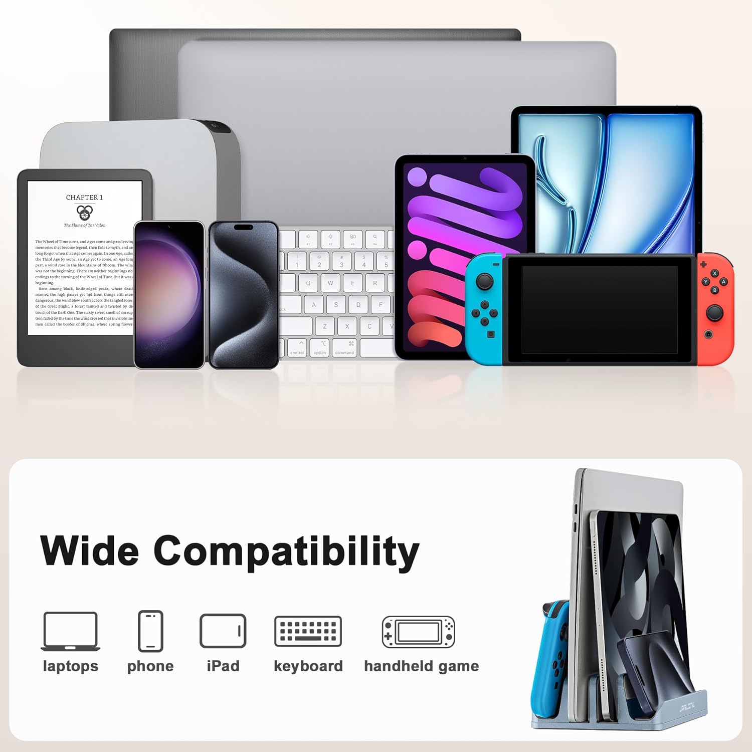 - Innovative Dual Slot Design: This 4-in-1 stand is engineered to hold two laptops and two cellphones vertically simultaneously, doubling your productivity. It uses your desktop space efficiently, keeping your workspace tidy and organized.