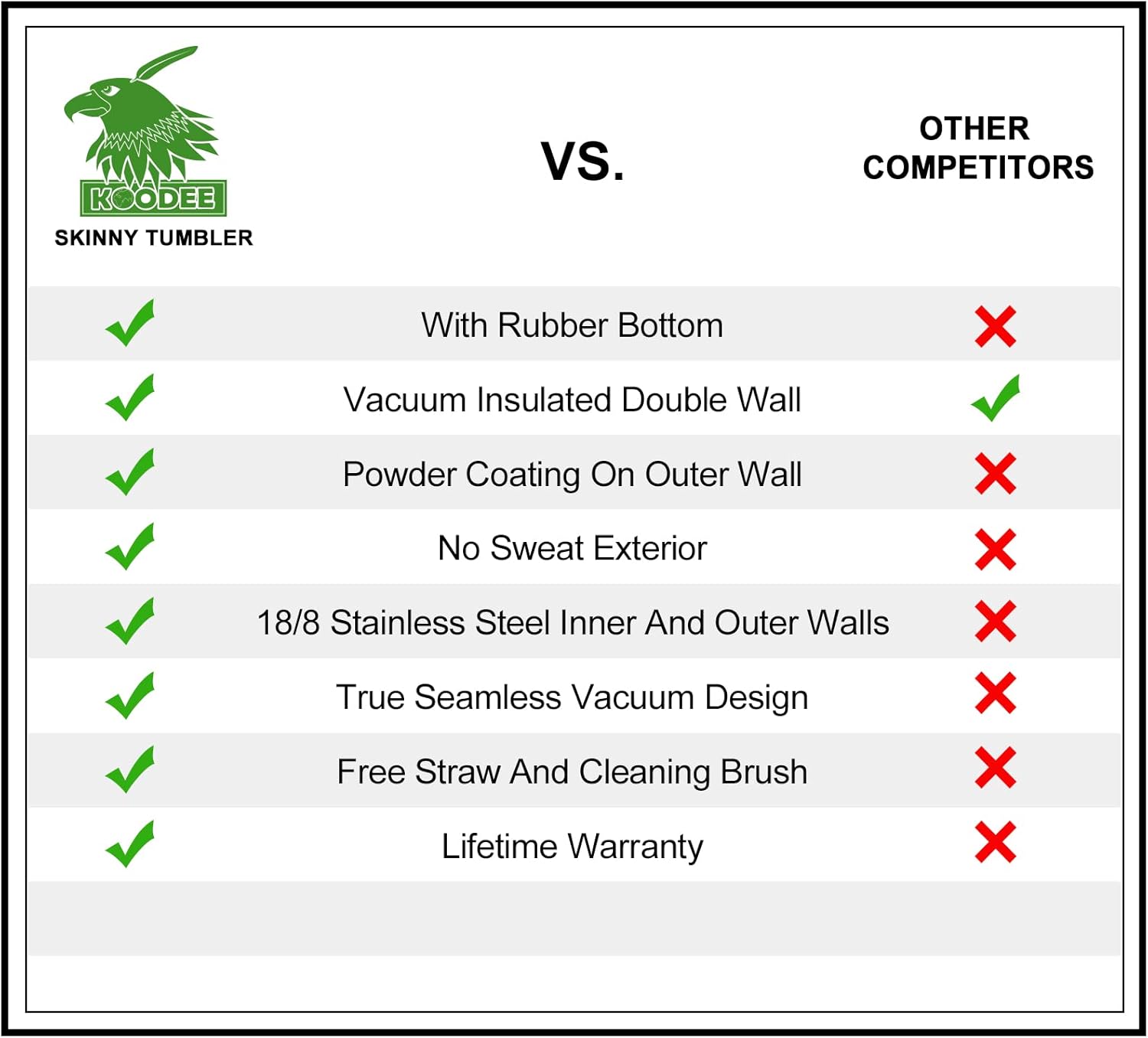 - 🍺Double-Wall Vacuum: KOODEE stainless steel skinny tumbler adopts double-layer vacuum heat insulation technology. Keep hot drinks for 12 hours and cold drinks for 24 hours. Vacuum technology makes the outer wall sweat-free, no matter what beverage you drink, you can keep your fingers dry and will not burn your fingers
